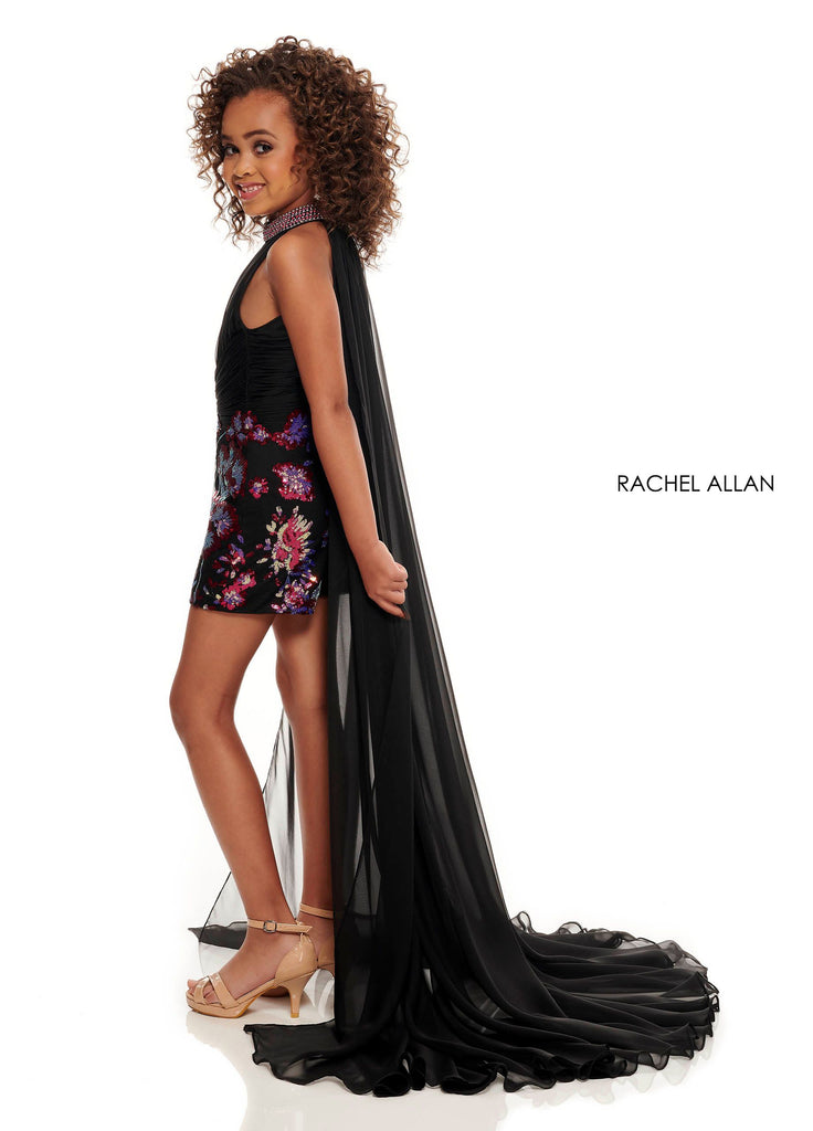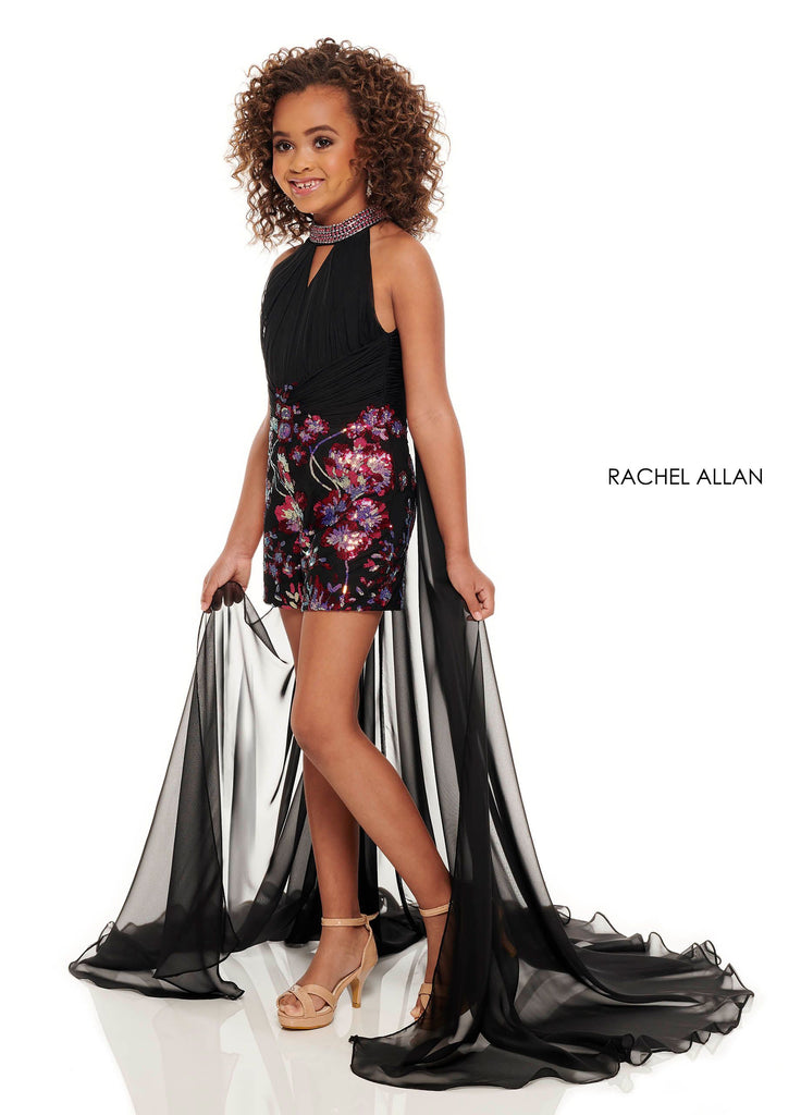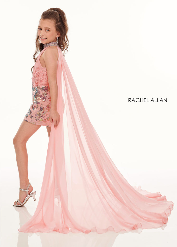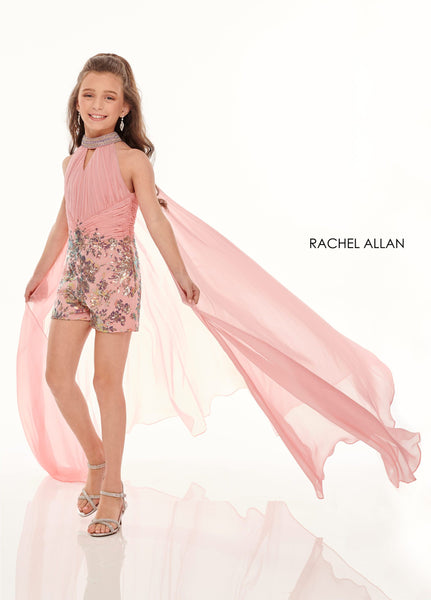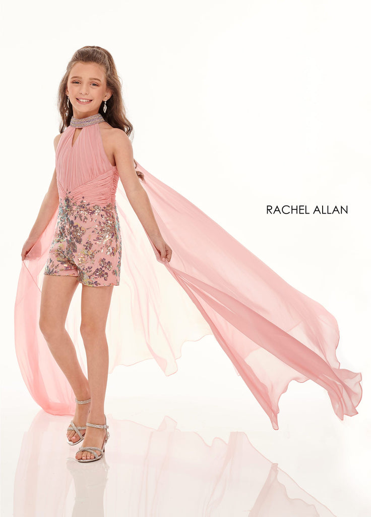 We can't handle the cuteness over this sequin net two-tone romper made with so much love for your little. Detailed with a ruched bodice and choker neckline, this chiffon cape-like train extends from the back of the neckline.