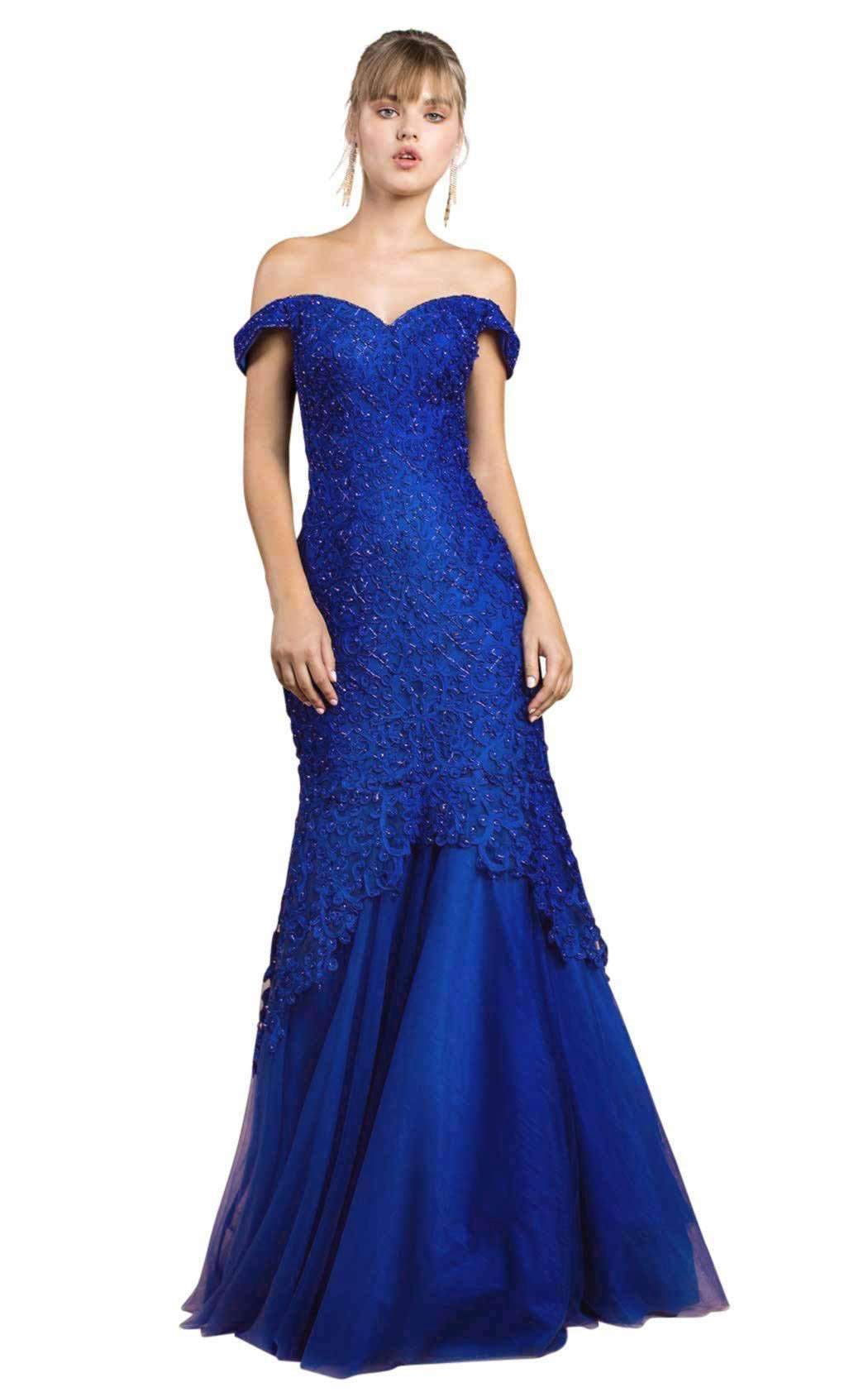 Ornament your evening with this glamorous gown by Andrea & Leo. A savvy off-the-shoulder neckline sets a sumptuous precedent at the bodice while crystal-dusted appliques highlight a curve-defining fit with glam glints. Contrasting lining provides a sensuous sense of depth. The sleek, applique-clad skirt sluices a taper at the knee where a sheer-layered flounce supplies a finishing flourish to the feet.