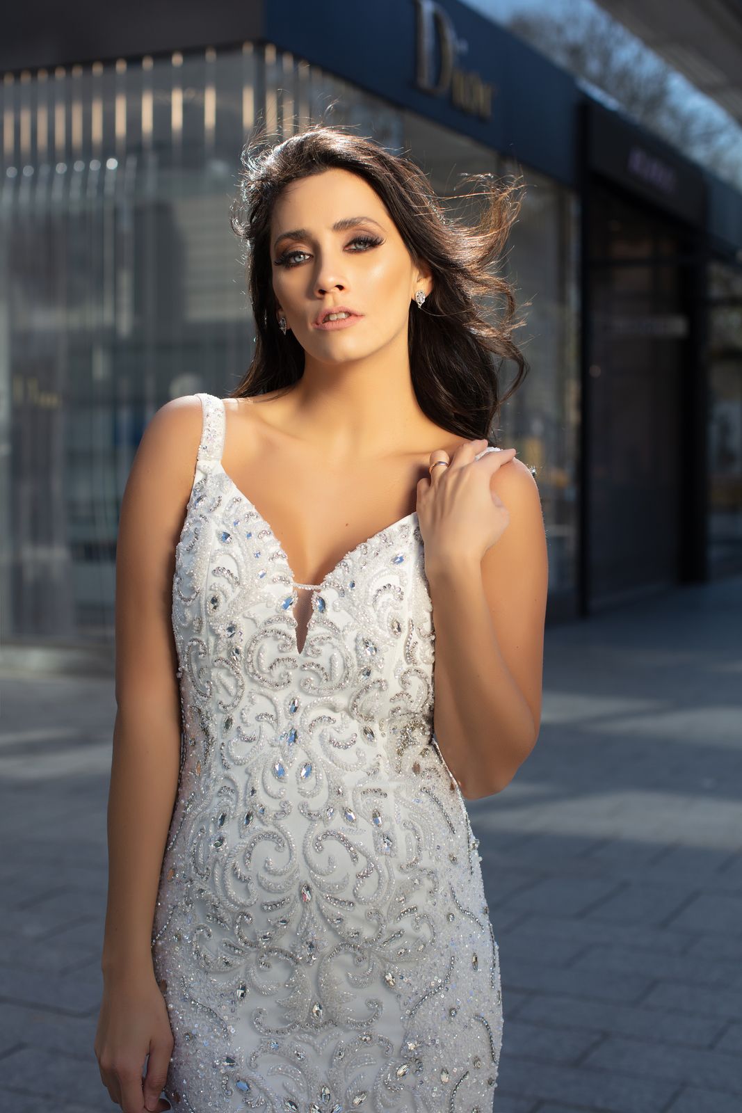 Look absolutely charming in Chic and Holland HF1539 Dress. This marvelous piece features a column silhouette and fully sparkling. The sleeveless bodice has a v-neck neckline and a natural waist.