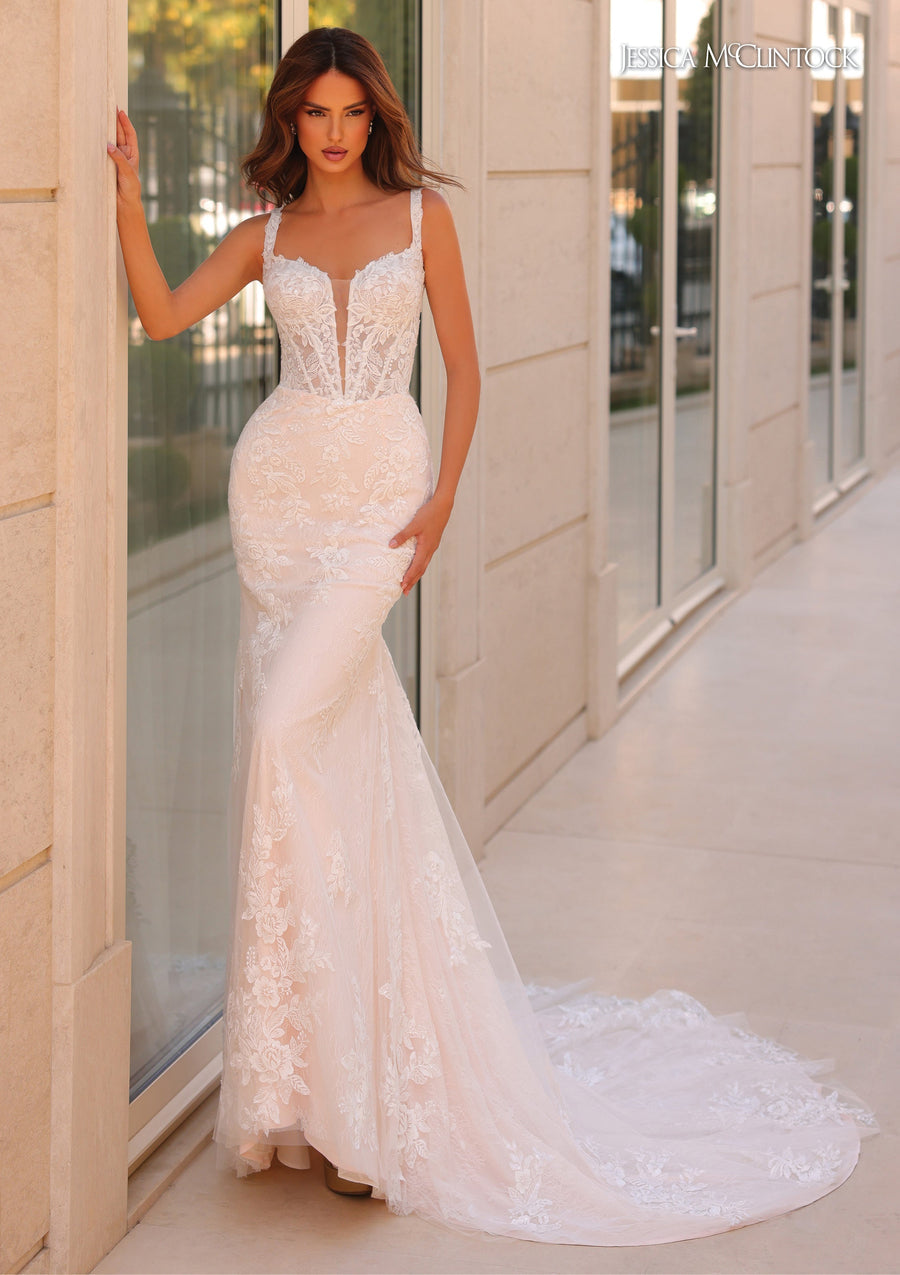 This gorgeous fitted lace wedding dress will add a touch of elegance to your special day. The sheer lace sleeves are detachable, dramatically changing the look of the gown, while the sweeping train adds the final touch.