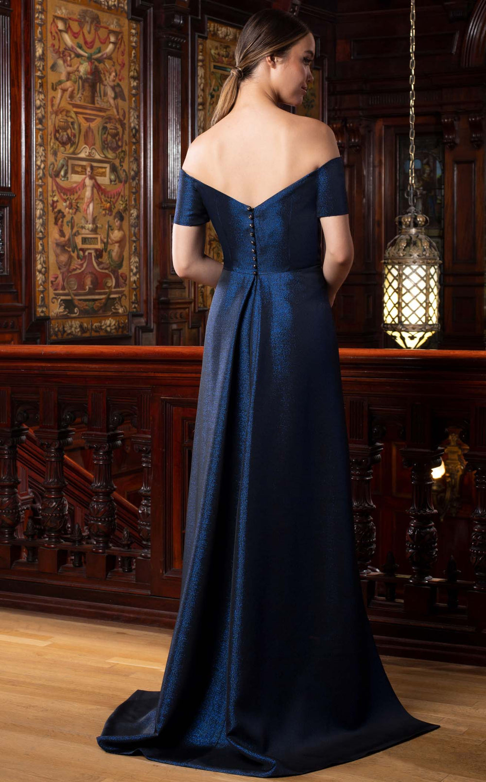 Look drop-dead gorgeous in this unique Ruffle Embellished Slit Sheath Silhouette with Slit by Daymor. The silhouette has an off-shoulder neckline with cap sleeves and a fitted bodice. The bodice has a large ruffled bow accessory that stretches from above the neckline to the thighs and continues into the skirt. The bow has a waist band across it making the attire more stylish. The sheath skirt sports a high leg slit, a sweep train on the backside, and is layered.