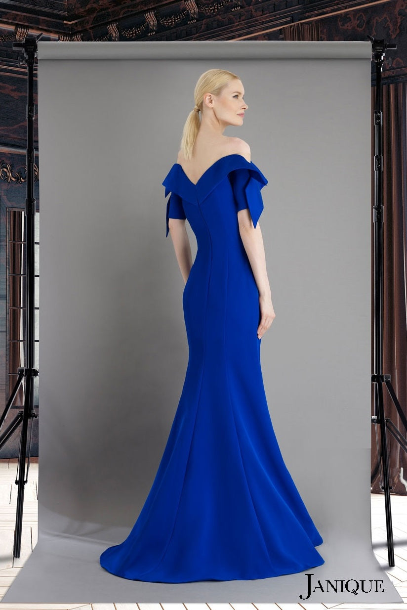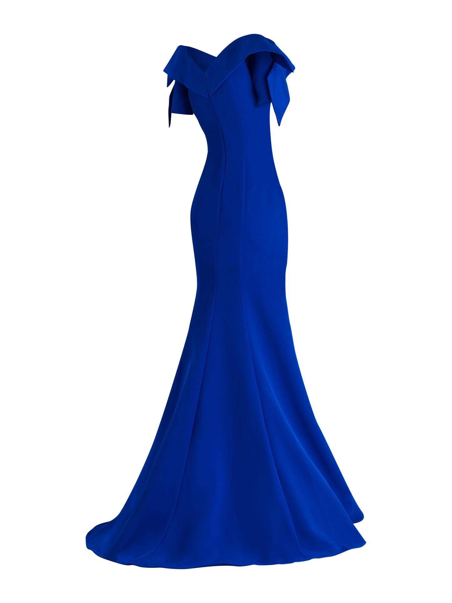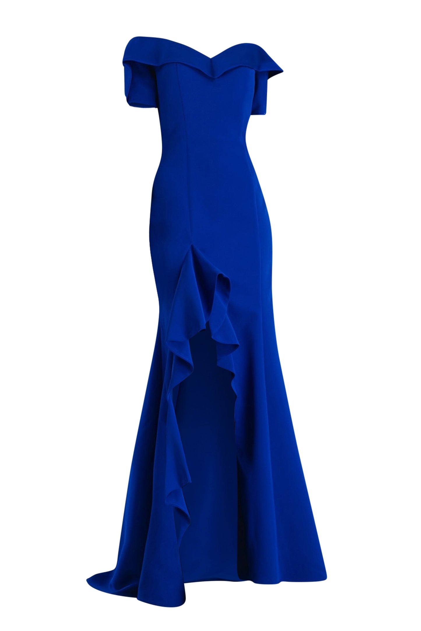 This gown will spice up any event. With off the shoulder sleeves and a ruffled front slit, you will cause a stir. This dress is made of stretch crepe which is easy to wear and very fitting to a woman’s curves. So show off your shoulders and legs while you cut a rug in this spicy number!