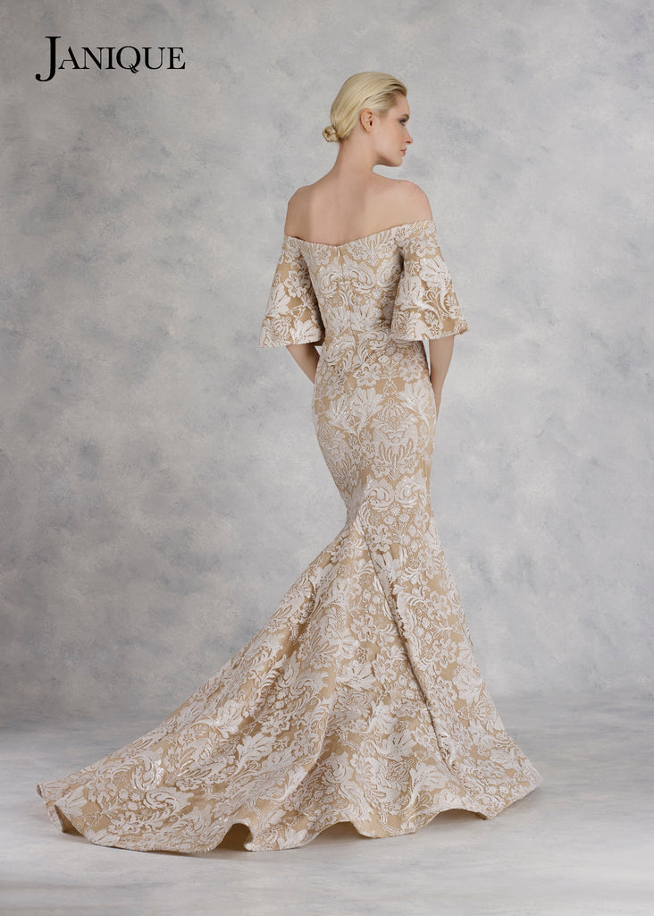 This Janique JA3013 formal dress features a floral-appliqued trumpet silhouette, with butterfly sleeves edging the notched off-the-shoulder neckline. A modesty insert lies on the decolletage. The semi-open back is offsetted with a court train.