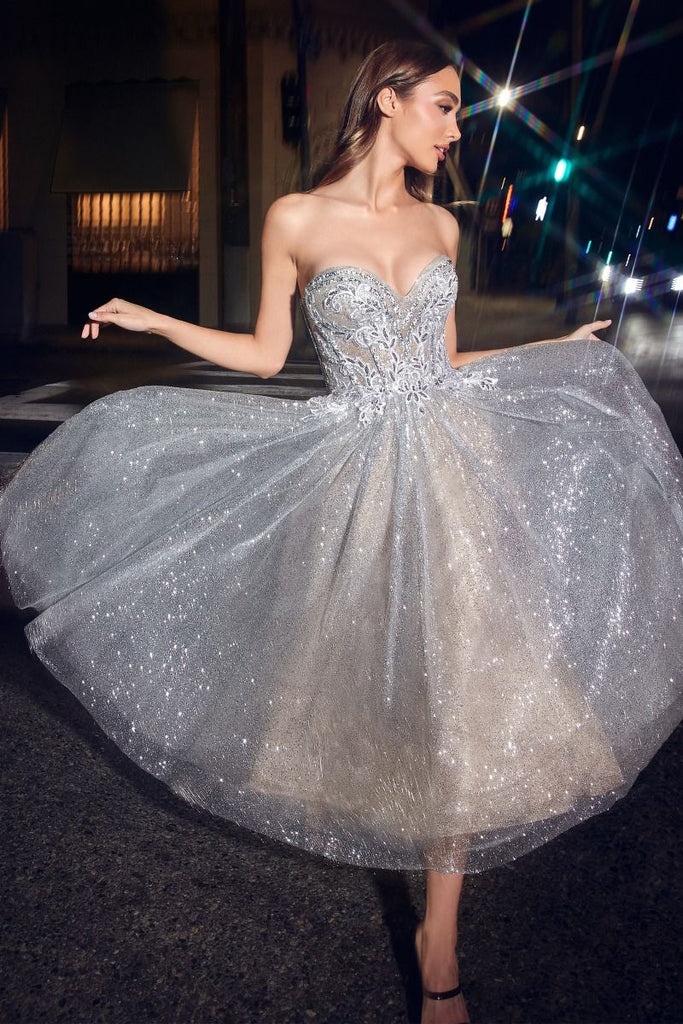 STRAPLESS TEA LENGTH GLITTER DRESS