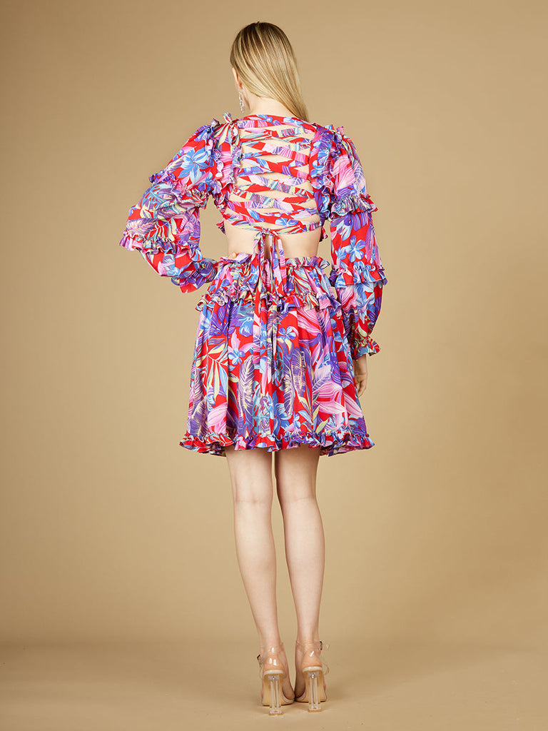 SO MUCH FUN! This is THE V-neck print short with cut outs! The flutter details at the waist with a lace-up back are for easy fits. It is meant to be fun, flirty and flowy! This is one of our favorite daytime cocktail short dresses coming soon.