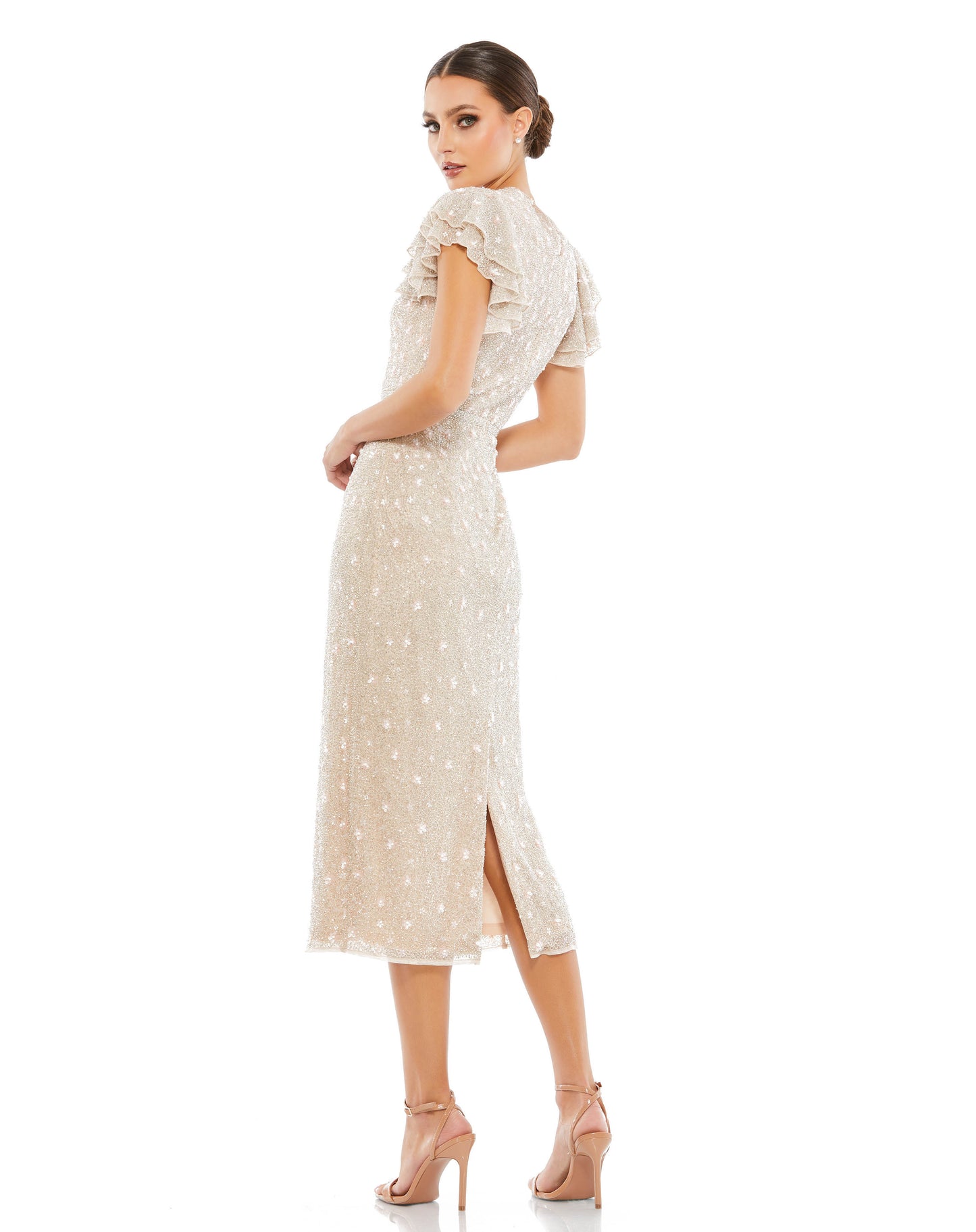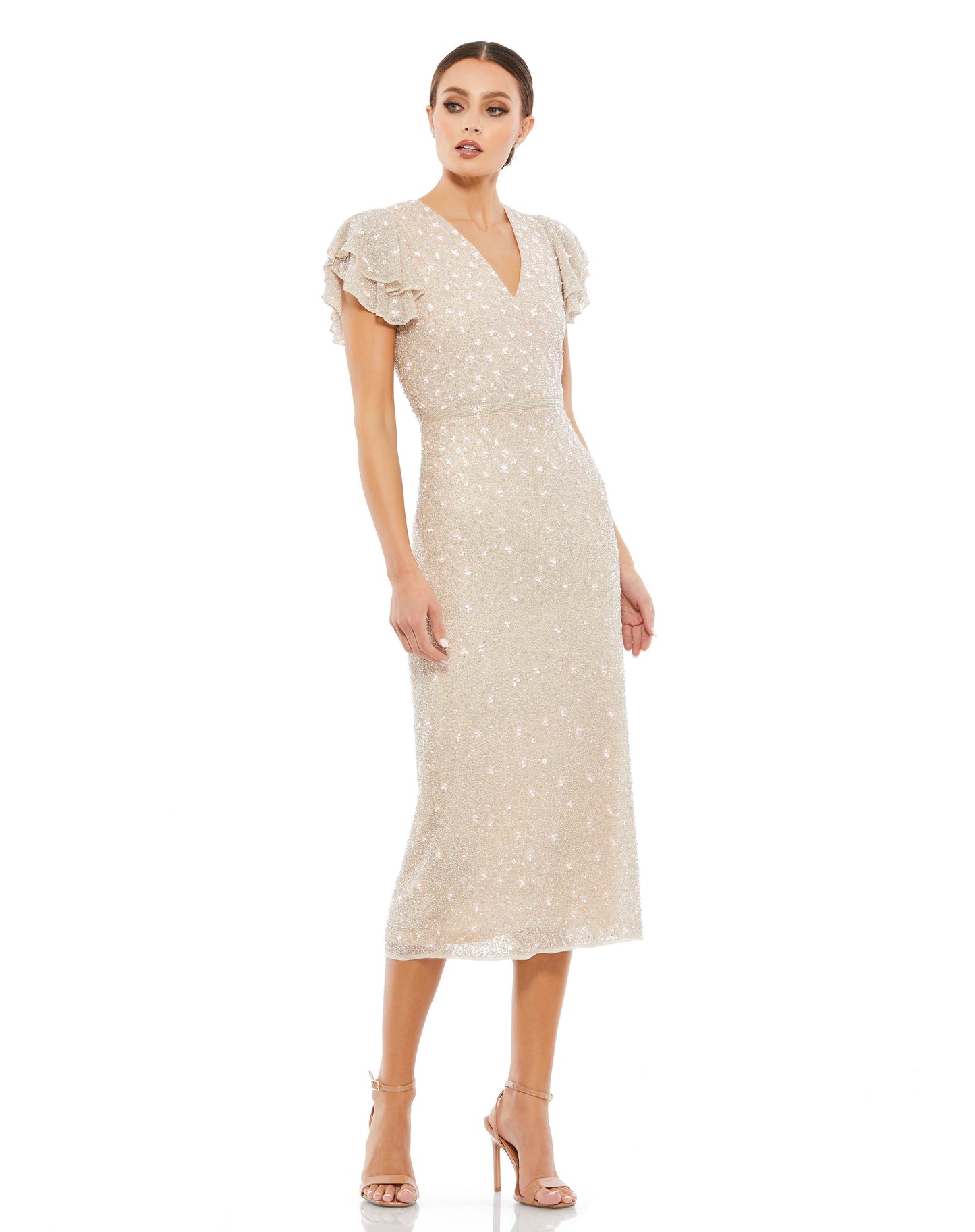 Elegant beaded v-neck midi dress with layered flutter sleeves, 3D floral sequin-and bead accents throughout, and a hand-beaded belt that accents the natural waist.