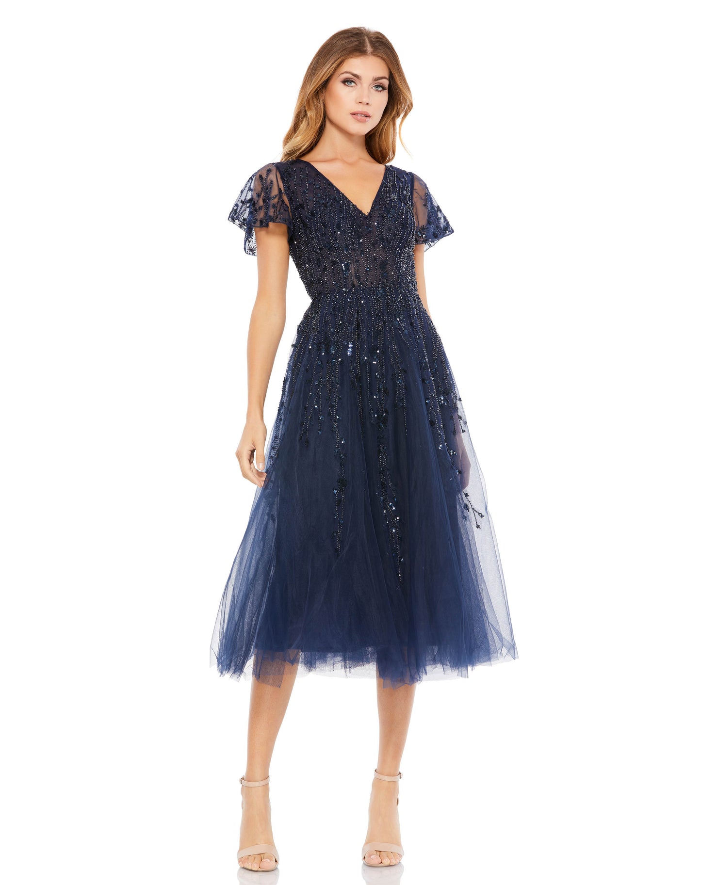 Elegant tea-length dress with semi-sheer short flutter sleeves and a flattering v-neck neckline. This dress has vertical beaded embellishment throughout the bodice and sleeve.