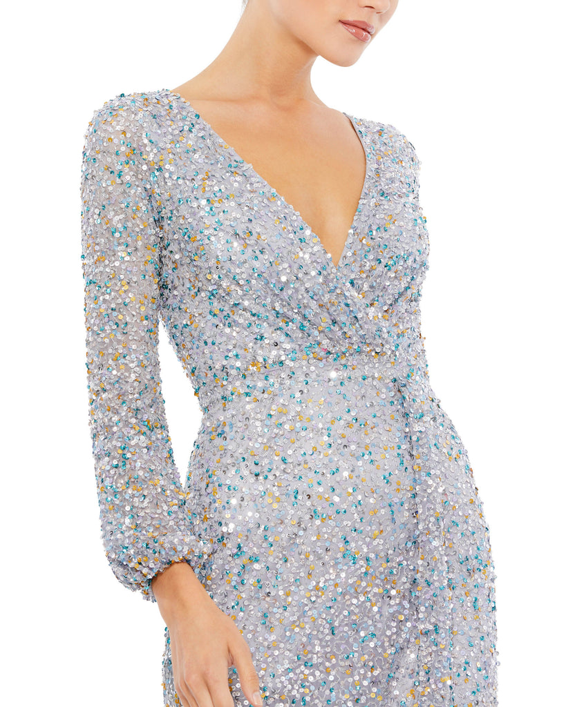 Multi-colored sequin evening gown with a plunging v-neckline, long sleeves, and thigh-high slit.