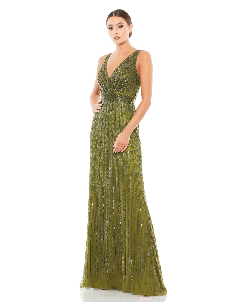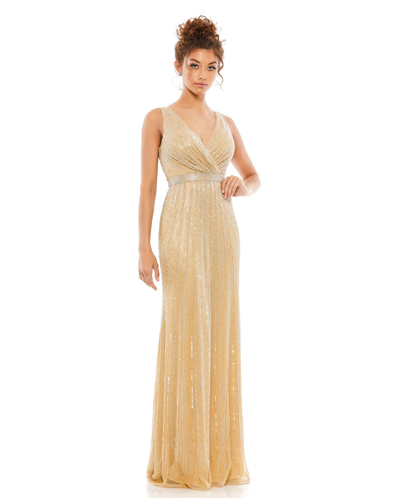 Plunging surplice gown with cascading rows of hand-sewn sequins and beads. Waist is accented by an intricately beaded belt and the gown features a v-back and sweeping train.
