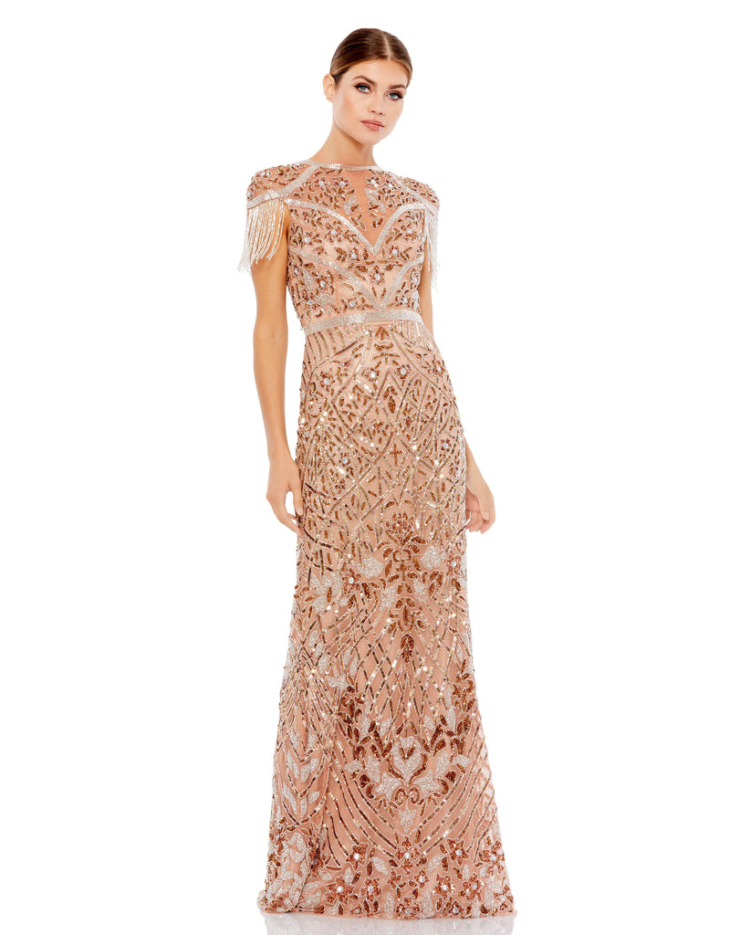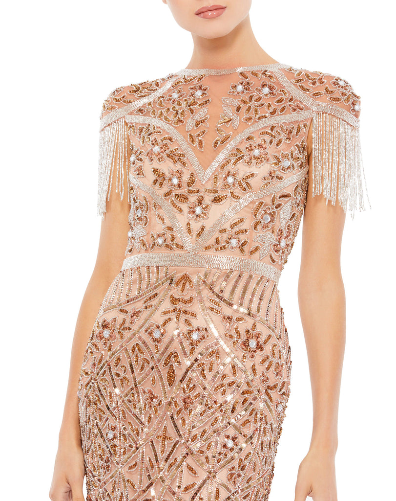 Stunning, fully-embellished column gown trimmed with beaded fringe cap sleeves.