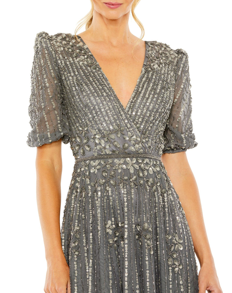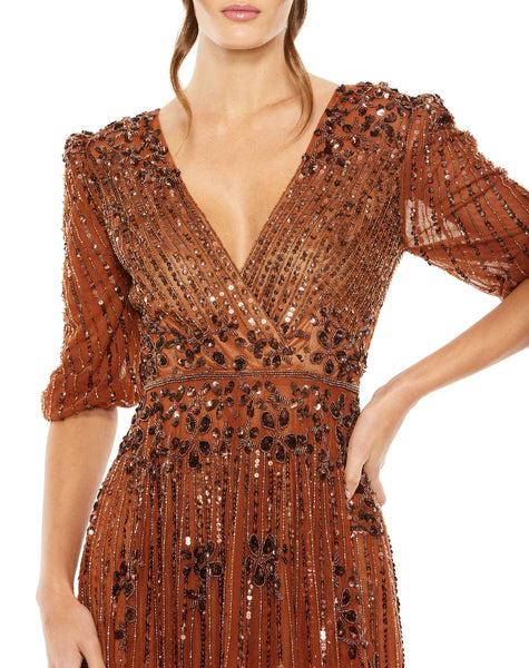 Fully lined through bodice and skirt; sheer unlined sleeves