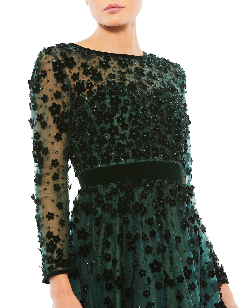Elegant tea-length cocktail dress with a semi-sheer illusion yoke and sleeves, tulle overlay skirt, and intricate velvet floral accents and beading throughout. A tonal velvet band accents the natural waist, and the skirt is finished with a velvet-trimmed bottom hem.