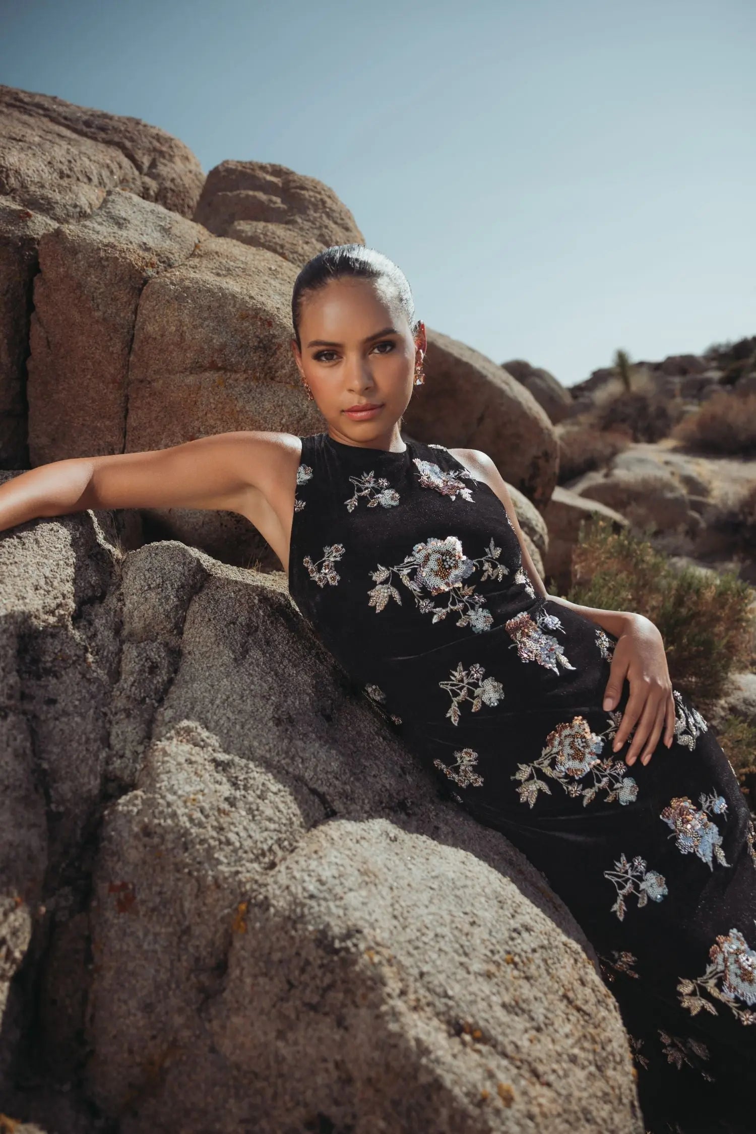 Perfect for black-tie weddings, galas, or red carpet moments, this black velvet column gown stuns with metallic floral embroidery and shimmering embellishments. Its iridescent finish creates a striking color shift, revealing hints of olive green over a bronze base as it catches the light with every step.