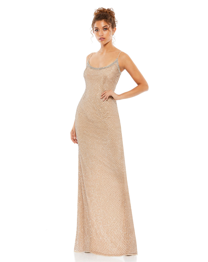Stunning fully-beaded gown accented with a rhinestone-encrusted scoop neckline and subtle back slit.