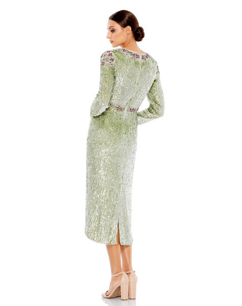 If a diamond necklace is your coveted accessory, then this decadent style is your wish list dress. The sensational dress is cut in a modest midi sheath completely covered in sequins that add texture and shine. Bloom-arranged jewels glitter at the collar, shoulders, and waist in a belt-like accent.