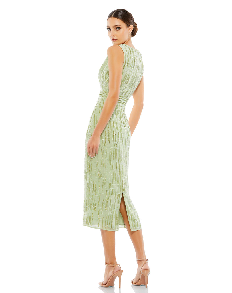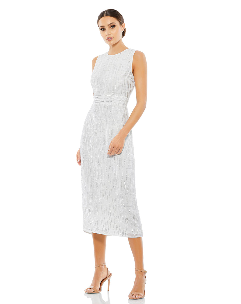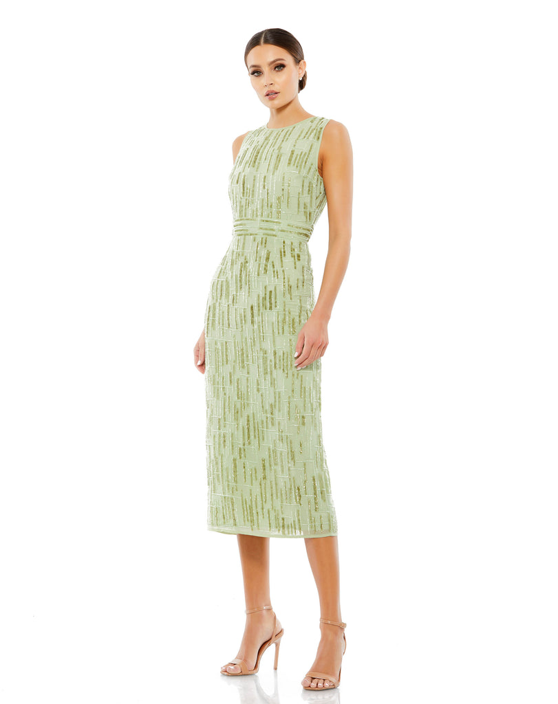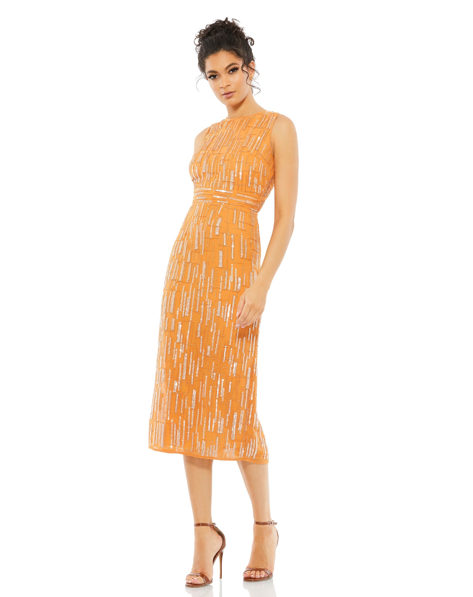 Chic sleeveless midi dress embellished with stripe-patterned sequins and beading.