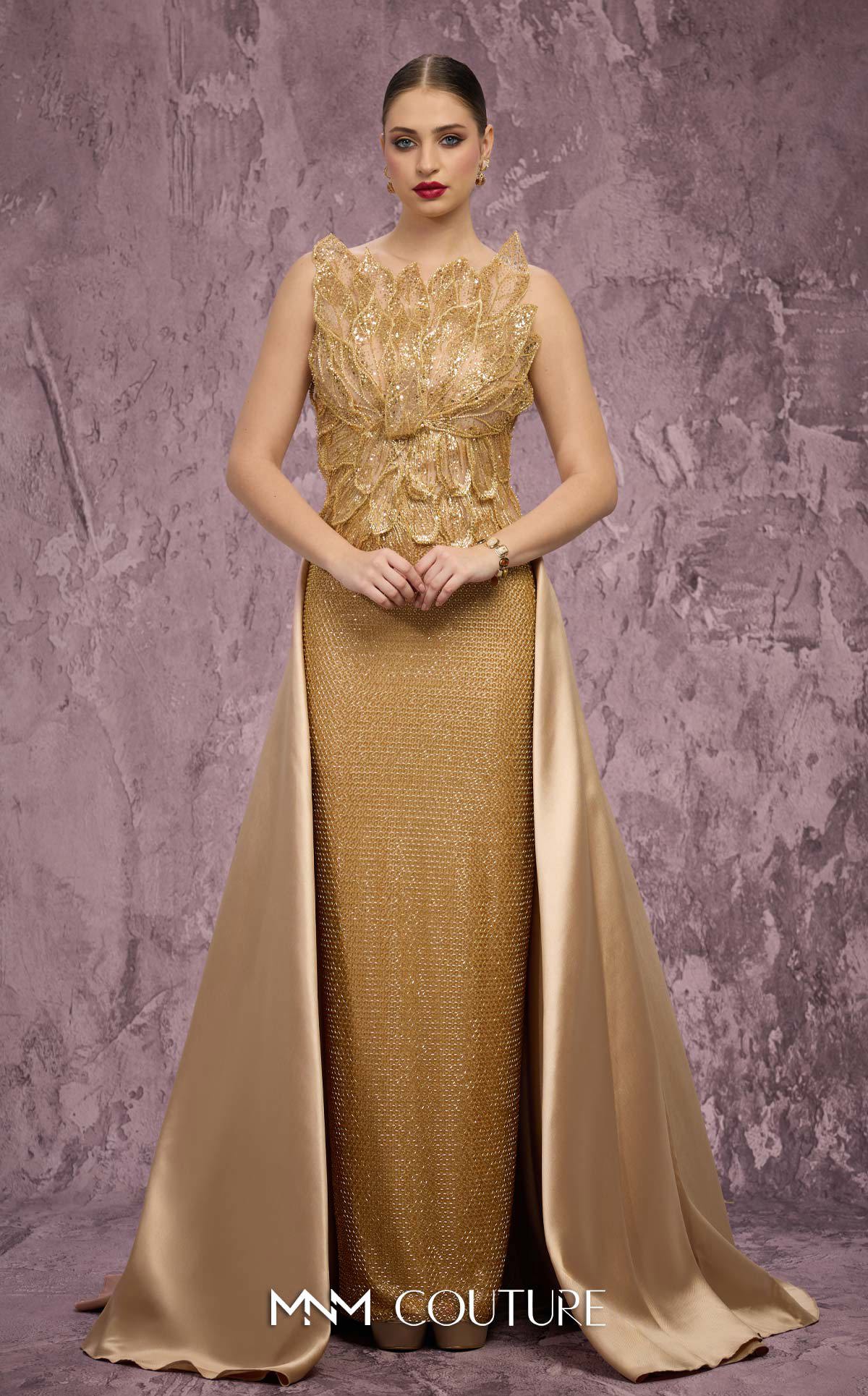 MNM Couture J03186 Step into a world of elegance and artistry with the Embroidered Dreams in Hollywood collection, where every stitch tells a story.This elegant, shimmering column gown is nothing short of breathtaking. Lazer-cut shimmering beaded petals delicately hug the bodice, creating a soft floral detail to the front and back of the bodice. Intricate, resplendent beadwork adorns this form-fitting silhouette, which is delicately enveloped in a taffeta peplum train overskirt.