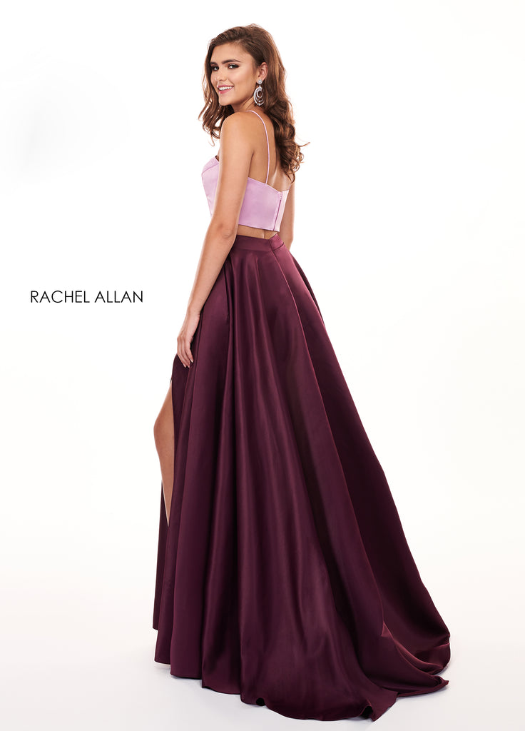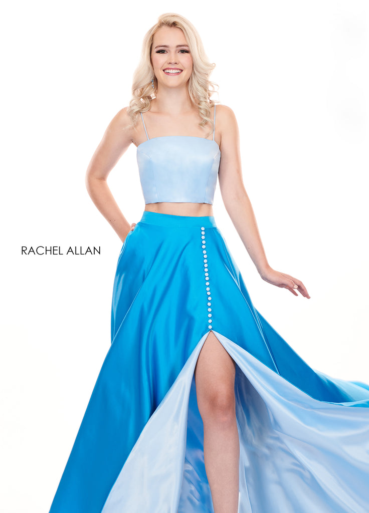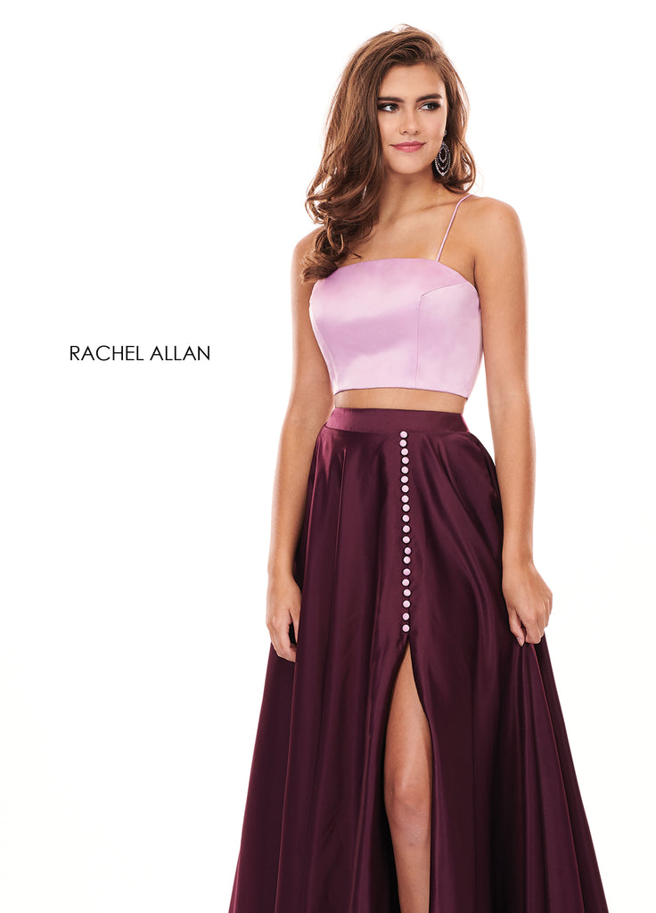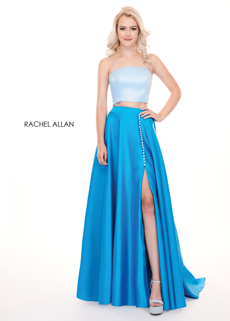 Bold color-blocking a thigh-high split make this 2-piece style stand out in the crowd. This matte satin gown features a cropped bodice, thin straps, side pockets and contrasting colored buttons on the skirt.