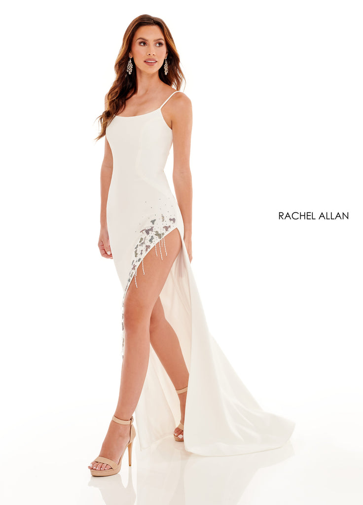 A gorgeous fitted gown made of scuba fabrication and a lace-up back will steal the show. This simple, high slit gown is detailed with sequins/stone aligning the slit.