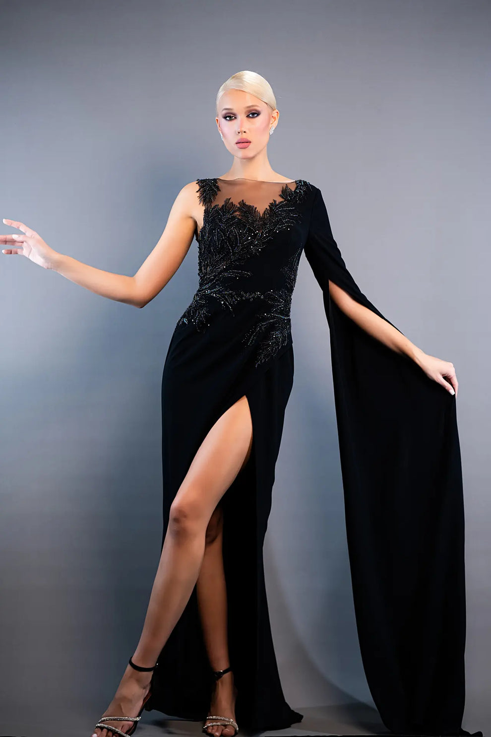 Perfect for formal events, cocktail parties, or evening occasions, the crepe dress with a one-shoulder cape is sure to make a statement wherever you go.