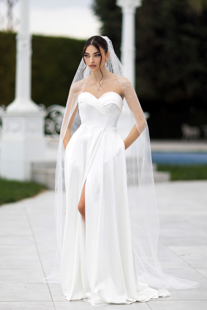 This modest style is crafted for the modern bride who seeks a touch of sensuality in her wedding day look. The satin material on floor sweeping TW105 makes for a clean, minimal feel that stands the test of time. A strapless sweetheart bodice wraps around the bust beautifully and cinches at the natural waist ending with a side split floor-sweeping skirt. The slit on the side of the skirt is flirtatious and classy.