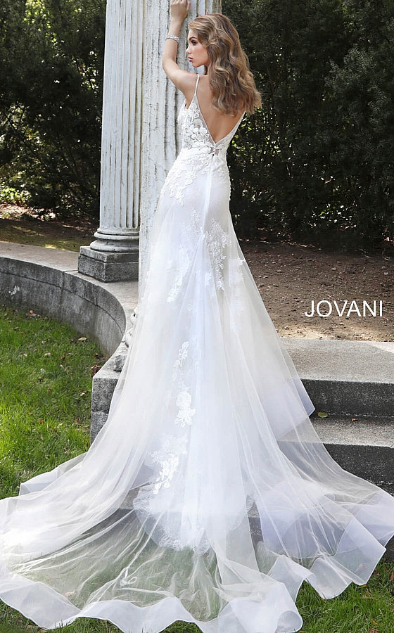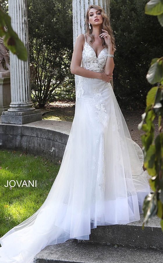 - Details: White floral embroidered wedding gown with spaghetti straps, sleeveless bodice, V-neckline, and sheer button-up V-shaped back, floor-length flowy pleated skirt with long sheer train.