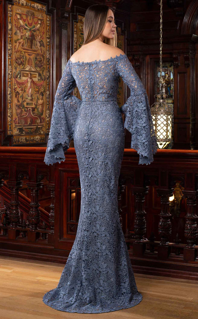 Embrace simplicity yet gracefulness with this Off-shoulder Floral Embroidered Sheath Silhouette by Daymor. The silhouette has an off-shoulder straight neckline that is paired with beautiful ruffled flounce sleeves. It comes with a fitted bodice hugging your curves. The sheath skirt falls swiftly forming a sweep train at the back. The entire surface of the silhouette has a floral embroidered layering that makes this dress an exquisite piece.