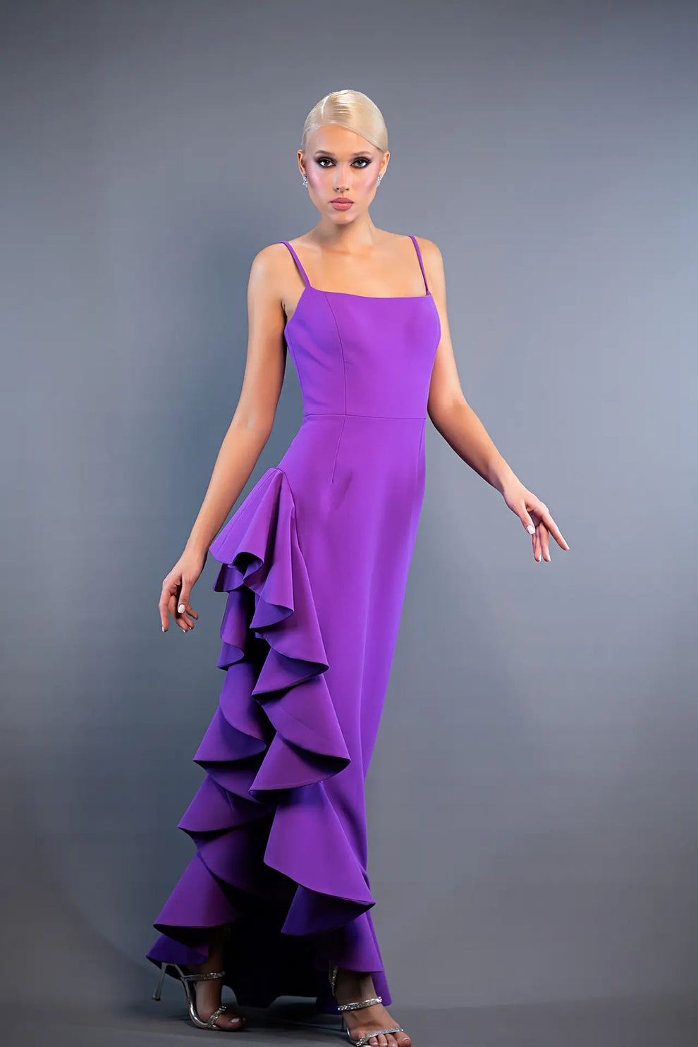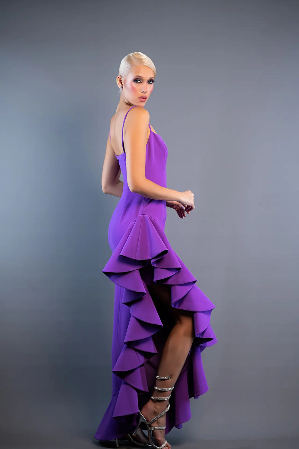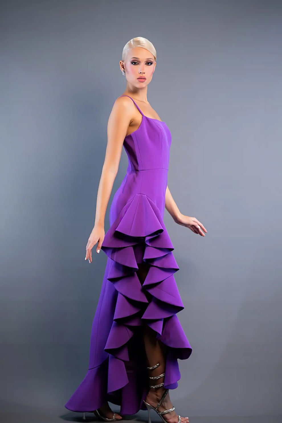 Whimsical cascade crepe dress; with layers of ruffles cascading down like a waterfall.