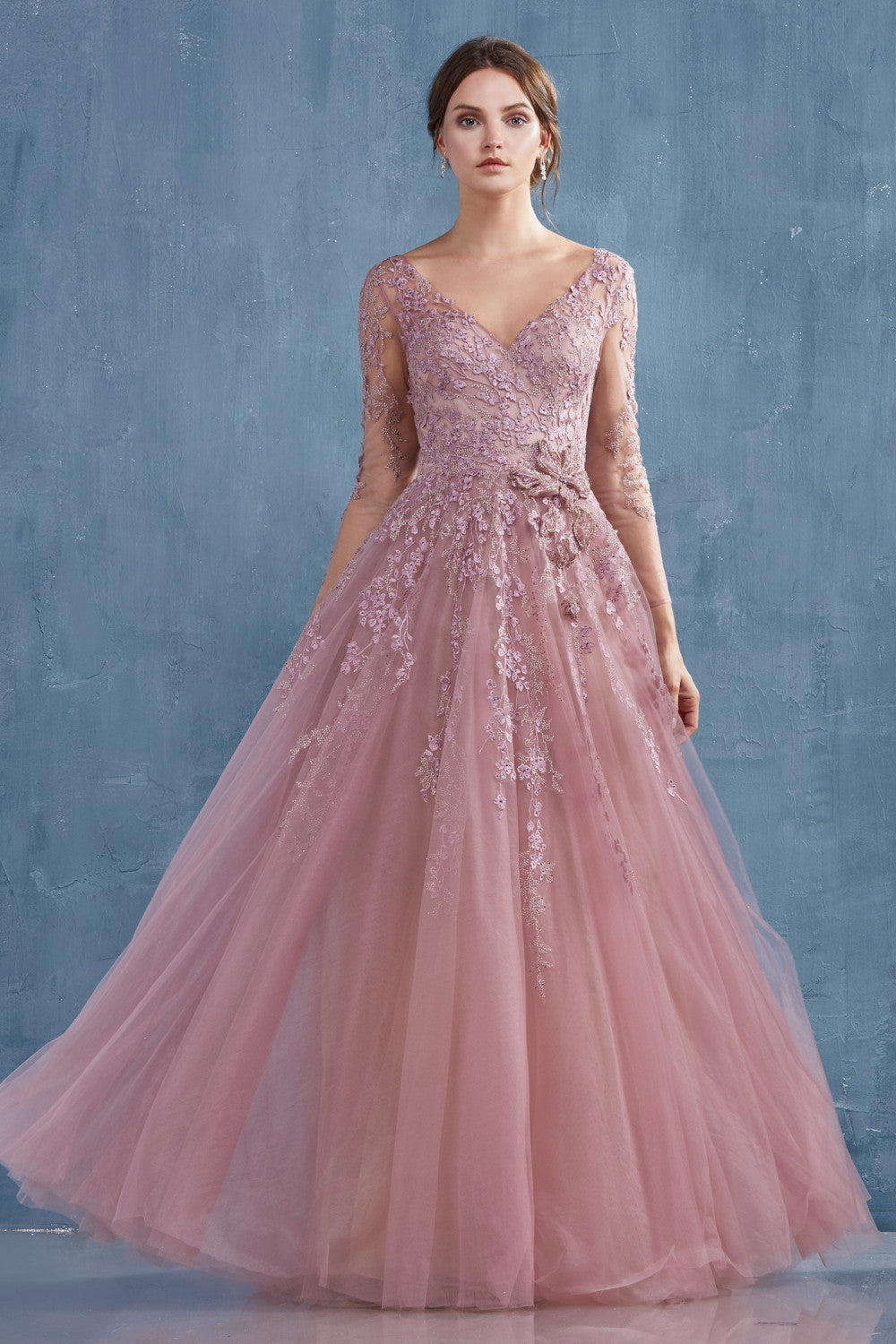 LONG SLEEVE CHERRY BLOSSOM TULLE A-LINE GOWN. BACK ZIPPER CLOSURE.