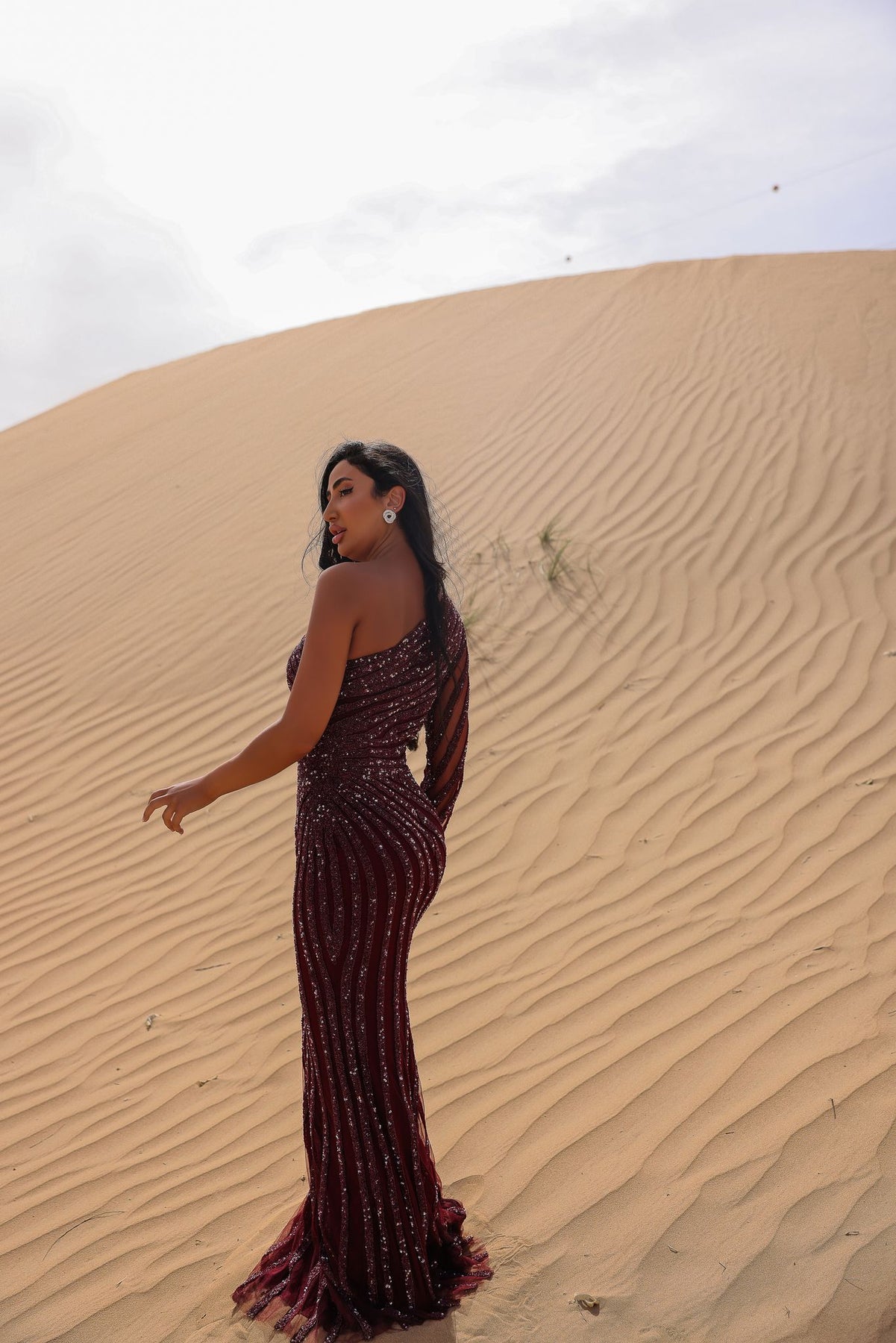 The perfect dress for a formal event, this dress by Chic and Holland is absolutely stunning. With an asymmetrical neckline and one shoulder, this dress will leave a lasting impression. The shimmery fabric is a perfect contrast to the gown's style. The fabric is thin and light, perfect for summertime or fall.