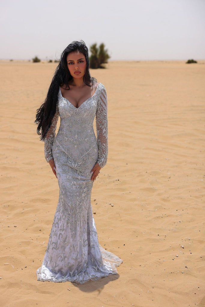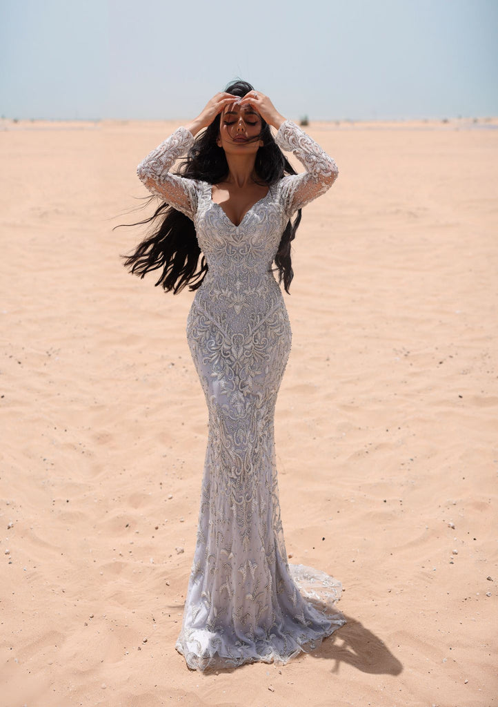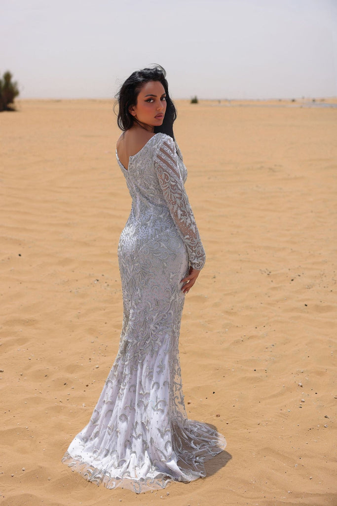 This gown by Chic and Holland is an elegant and classy choice for your formal occasion. This gorgeous dress is made of a luxe material that will hug your curves in all the right places. It has a full sleeve and an embellished top that adds just the right amount of sparkle. The full skirt is made of shimmering sequins and the train makes it easy to dance the night away