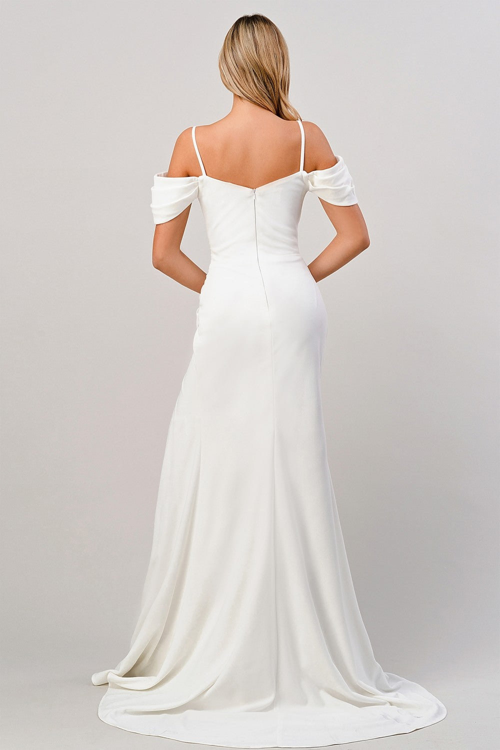 Designed for a more modern bride or courthouse wedding this sophisticated gown is perfection. The off the shoulder pleated sleeve drapes around the shoulders while a thin strap holds the gown. A sweetheart neckline pleats into the side seam for a flattering fit opening up to a subtle leg slit.