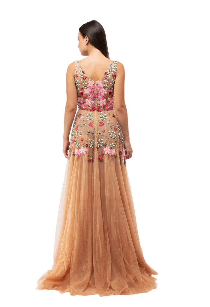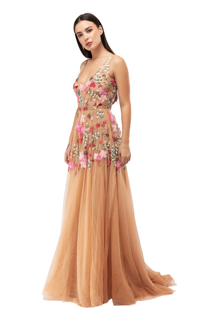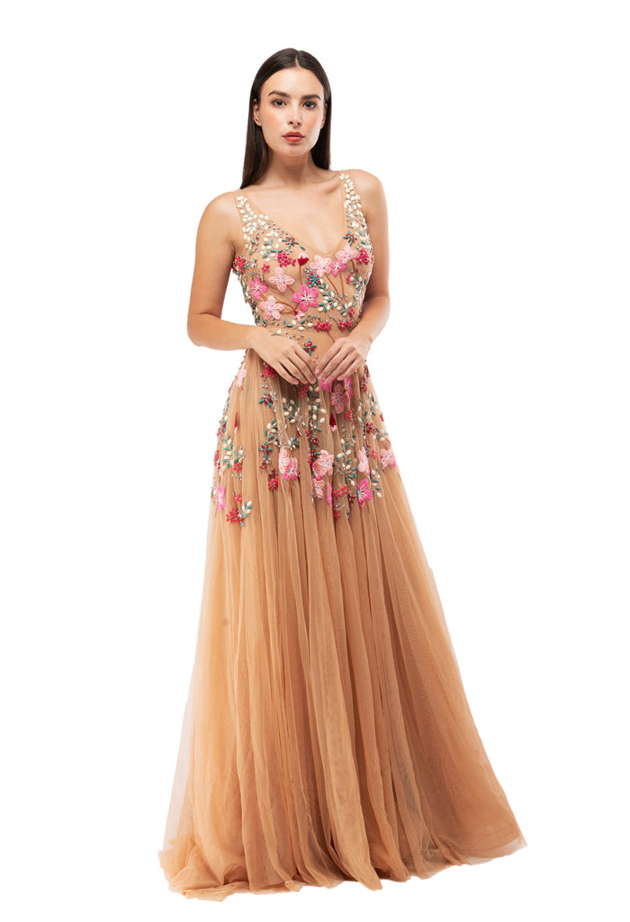 THE STYLE #19201111 IS LONG LENGTH DRESS, SURPRISE ROMANTIC LOVE, FRONT V-NECK LINE, HANDMADE COUTURE EMBELLISHMENT DETAILS THROUGHOUT.