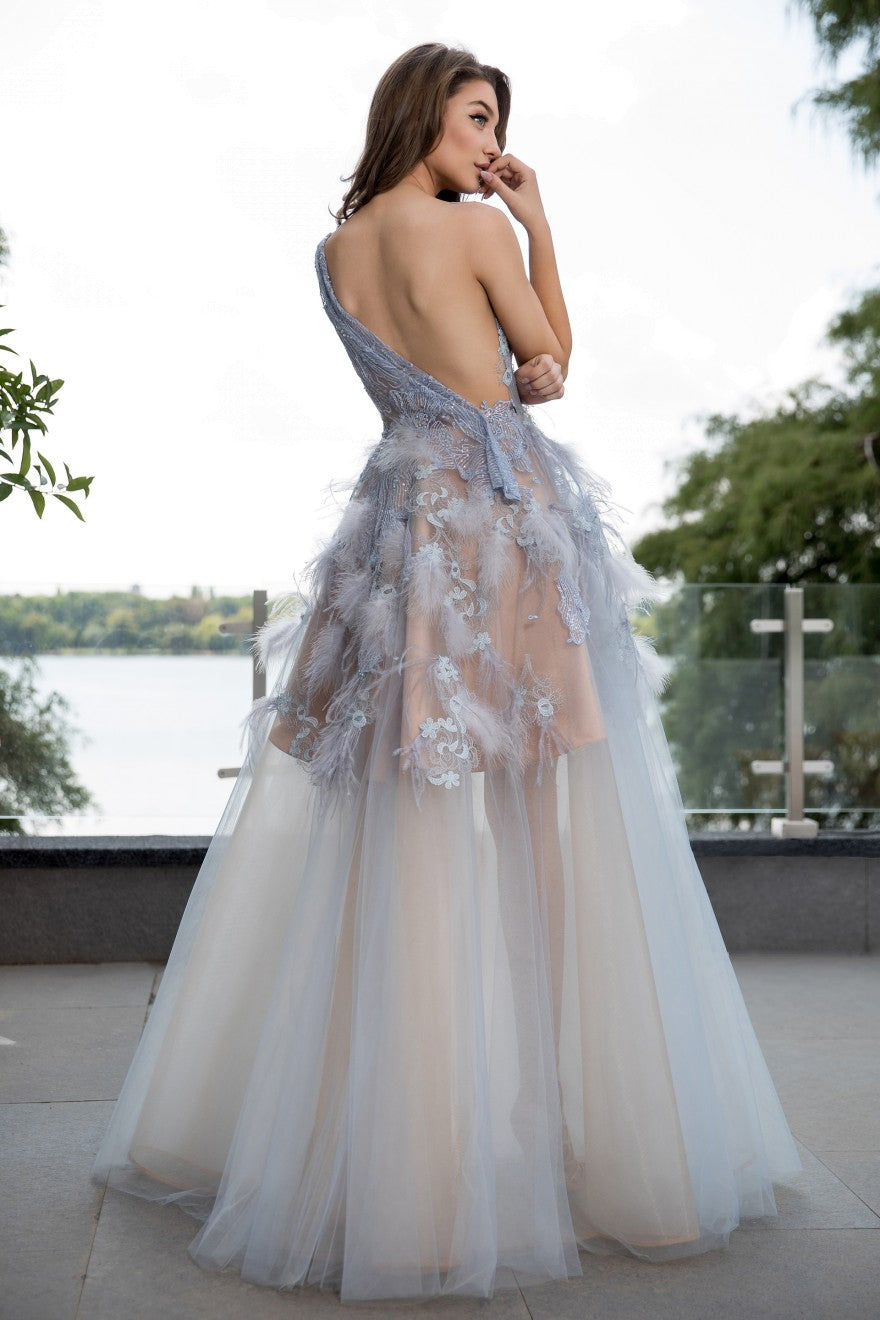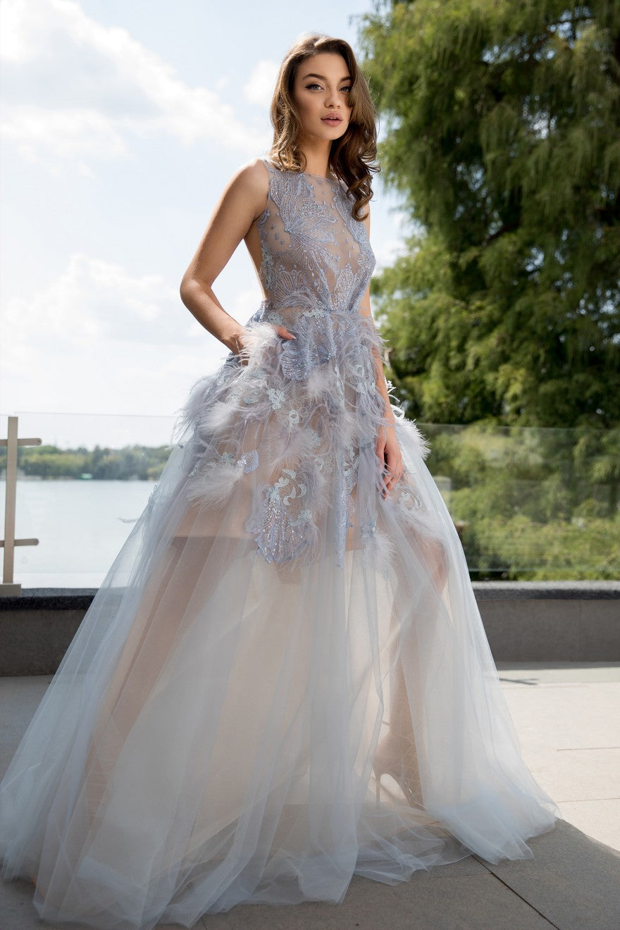 • Flowing, bias-pleated skirt, ostrich and swan feathers, 100% Italian polyamide tulle, pearls, beads and delicate handmade embroidery, partially lined, crepe lining for comfort, cryne nylon