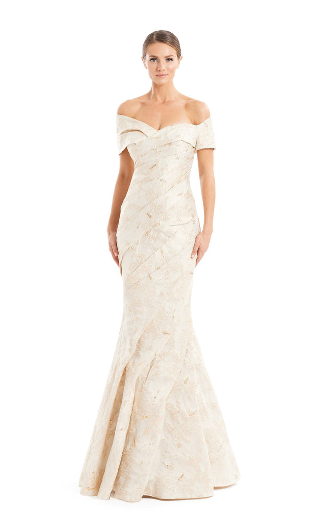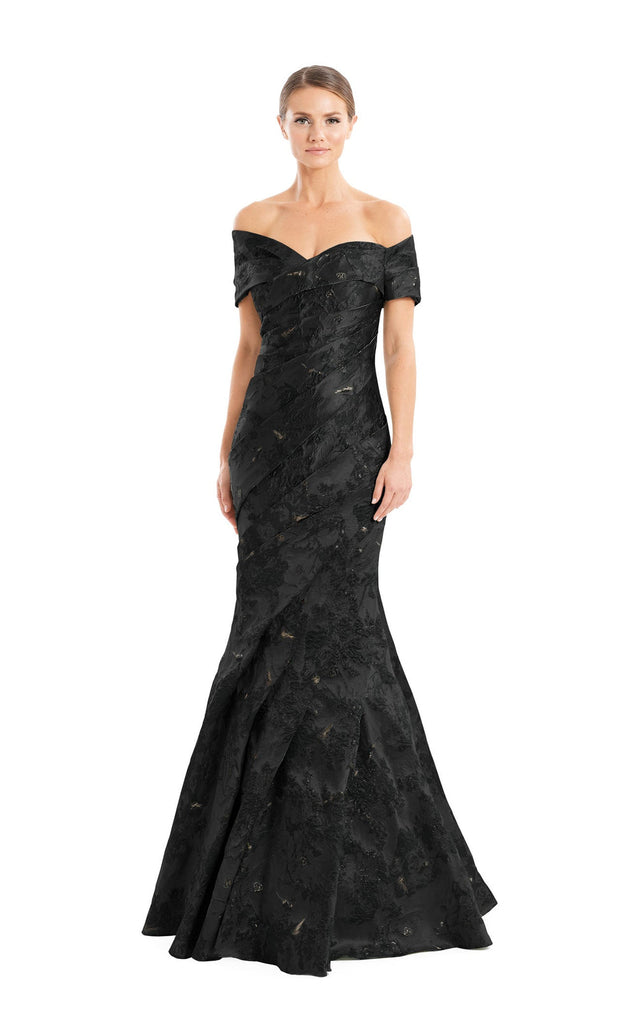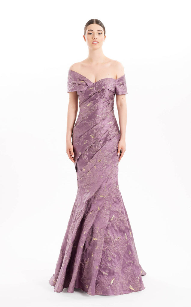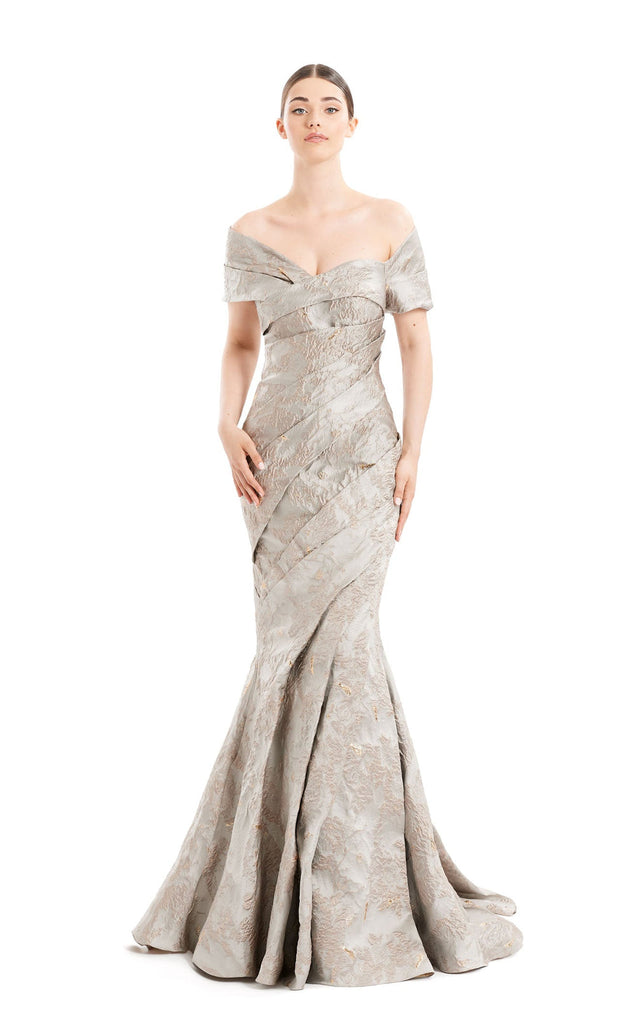 The textured fabric dress by Daymor is a gorgeous piece that is perfect for the modern woman. The form-fitting silhouette accentuates the female form and is made from a luxurious fabric. The dress is draped for a mermaid look, and features an off-shoulder sweetheart neckline. The long, draped skirt falls to the floor, ending in a short train.