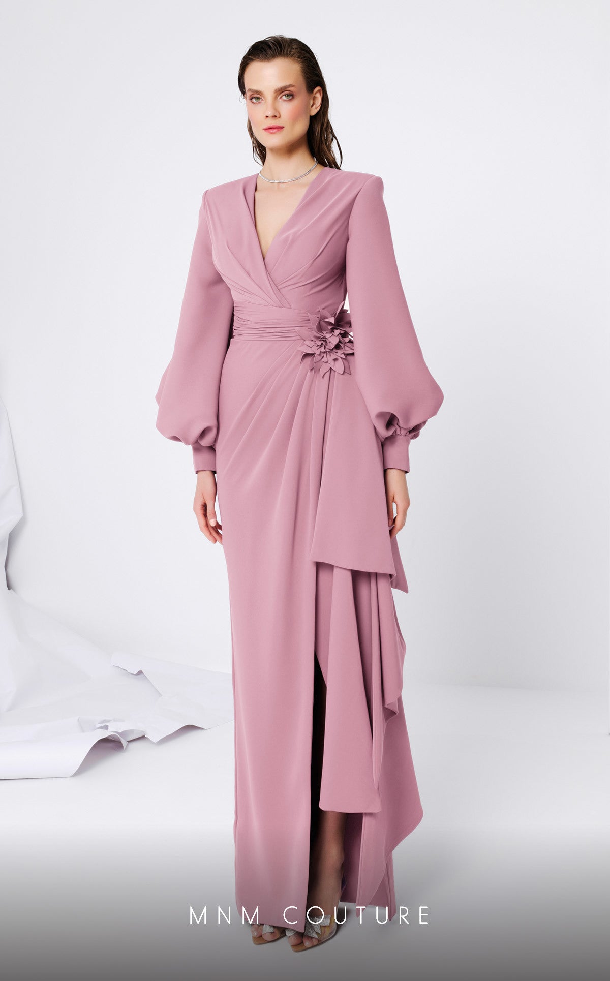 Step into timeless elegance with the MNM Couture F02866, a captivating crepe gown that showcases a sophisticated V-neck design paired with a classic Roman skirt and a daring side slit. This stunning piece is embellished with graceful drapes on the bust and waist, while the exquisite stones on the waist belt add a touch of glamour. The F02866 features a flattering fit-to-body silhouette accentuated by two charming puffed sleeves, making it the perfect choice for those who appreciate refined style and want to leave a lasting impression at any formal event