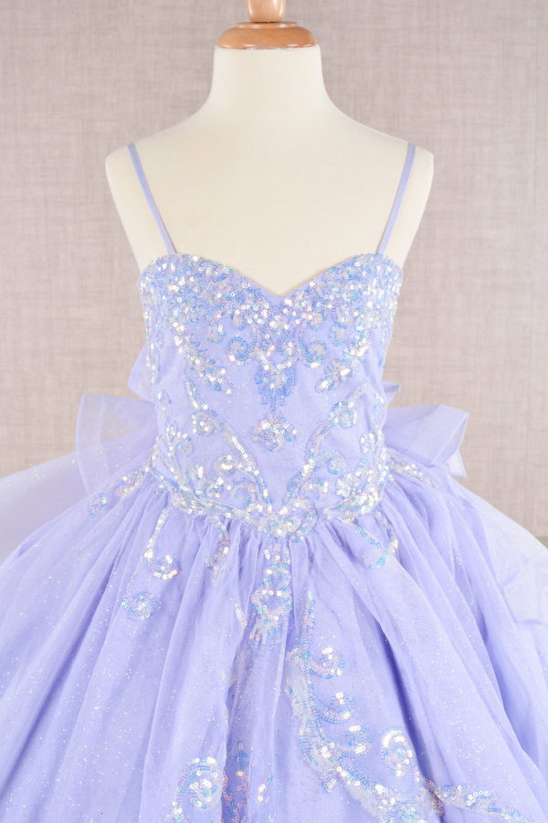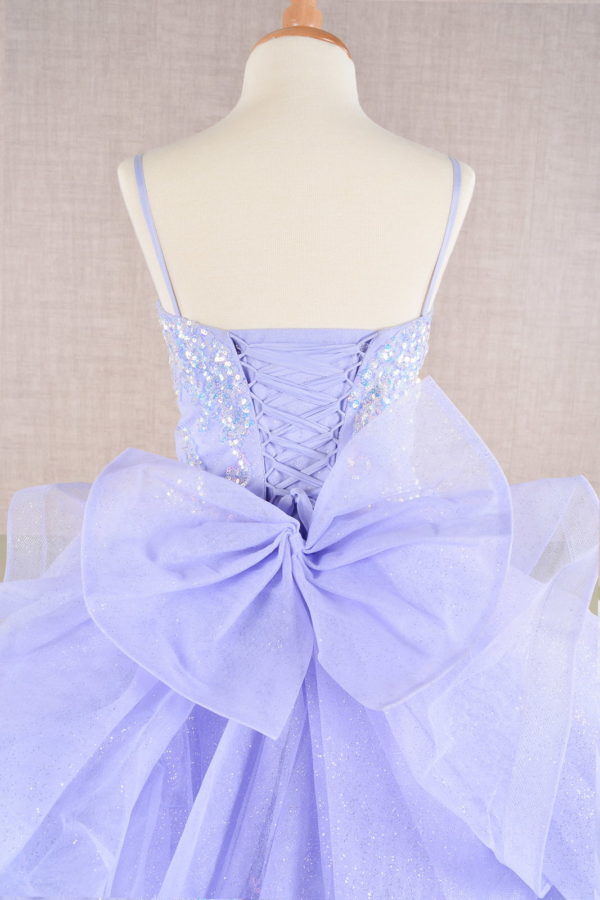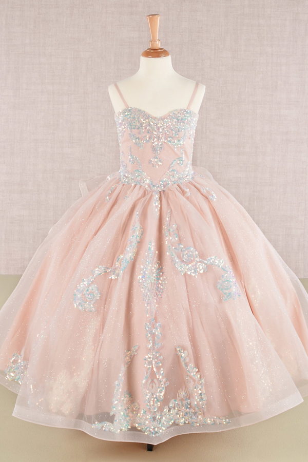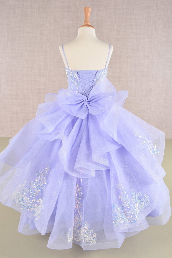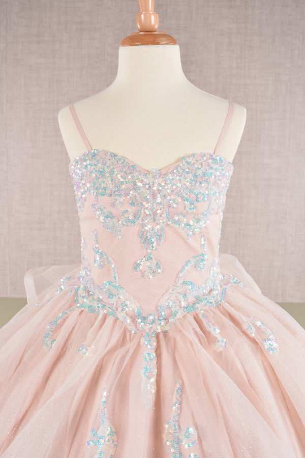 Spaghetti Strap Sequin Mesh Kids Dress with a Detachable Ribbon and Ruffled Back Skirt Available in Blush and Lilac