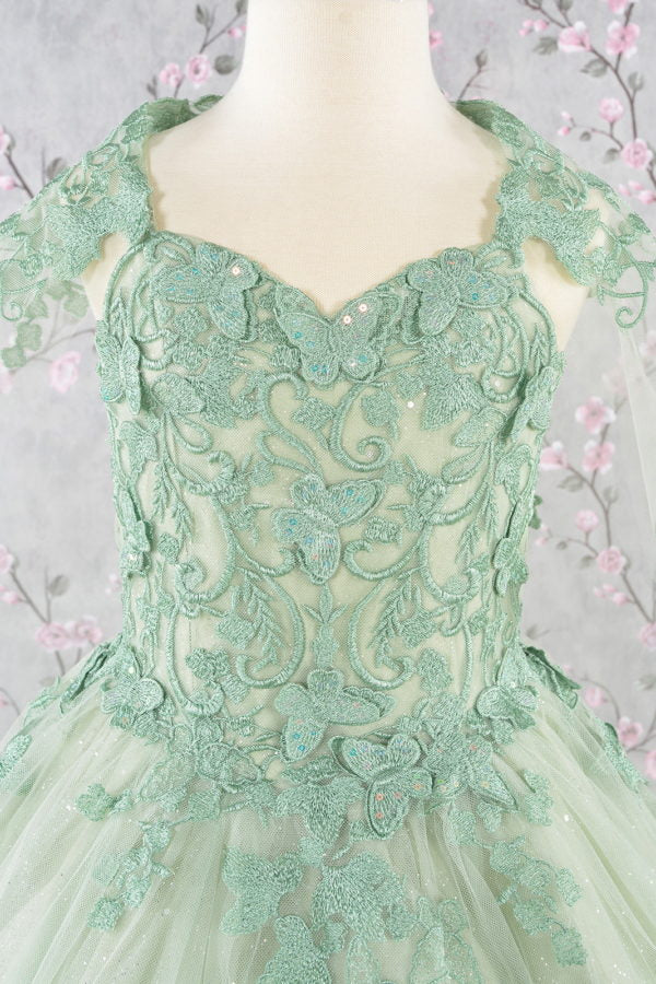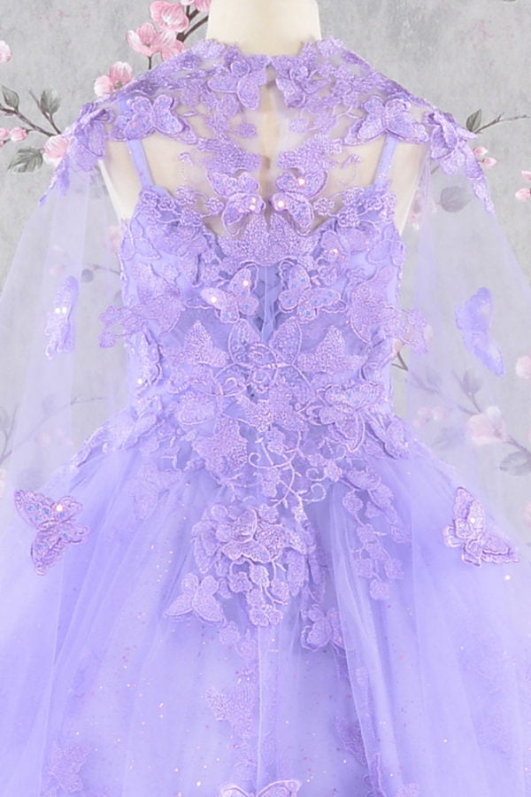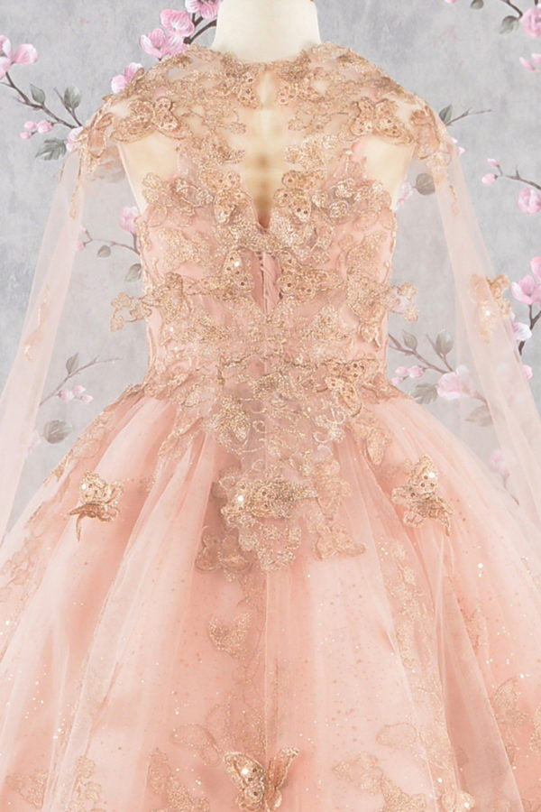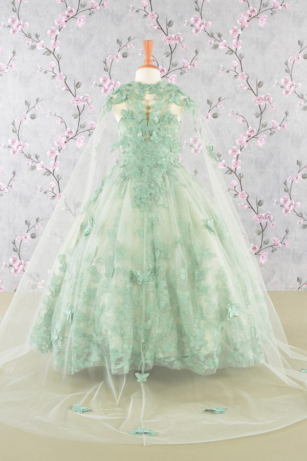 3-D Butterfly Sequin Mesh Kids Dress w/ Detachable Long Mesh Cape