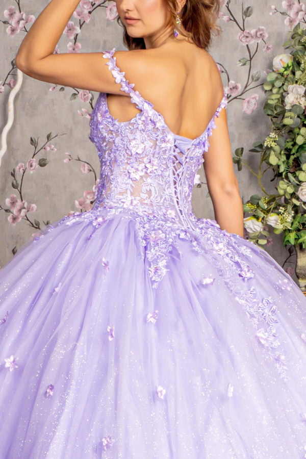 3-D Flower Jewel Glitter Sheer Bodice Mesh Ball Gown