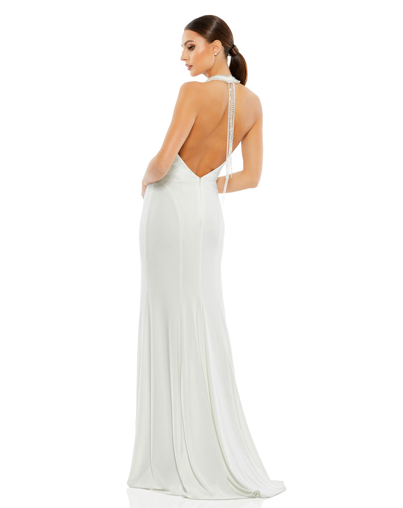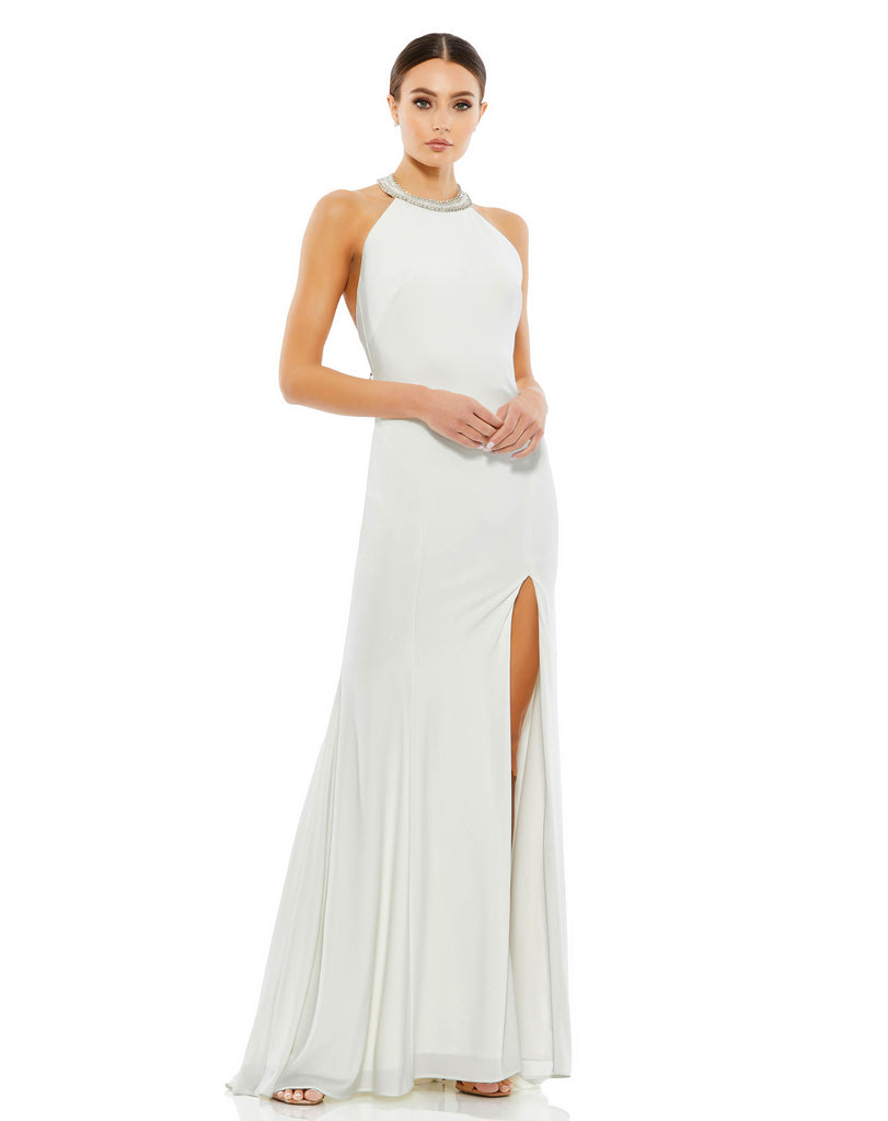 Sexy jersey gown accented with a bead-and-rhinestone embellished halter neck and a thigh-high slit.