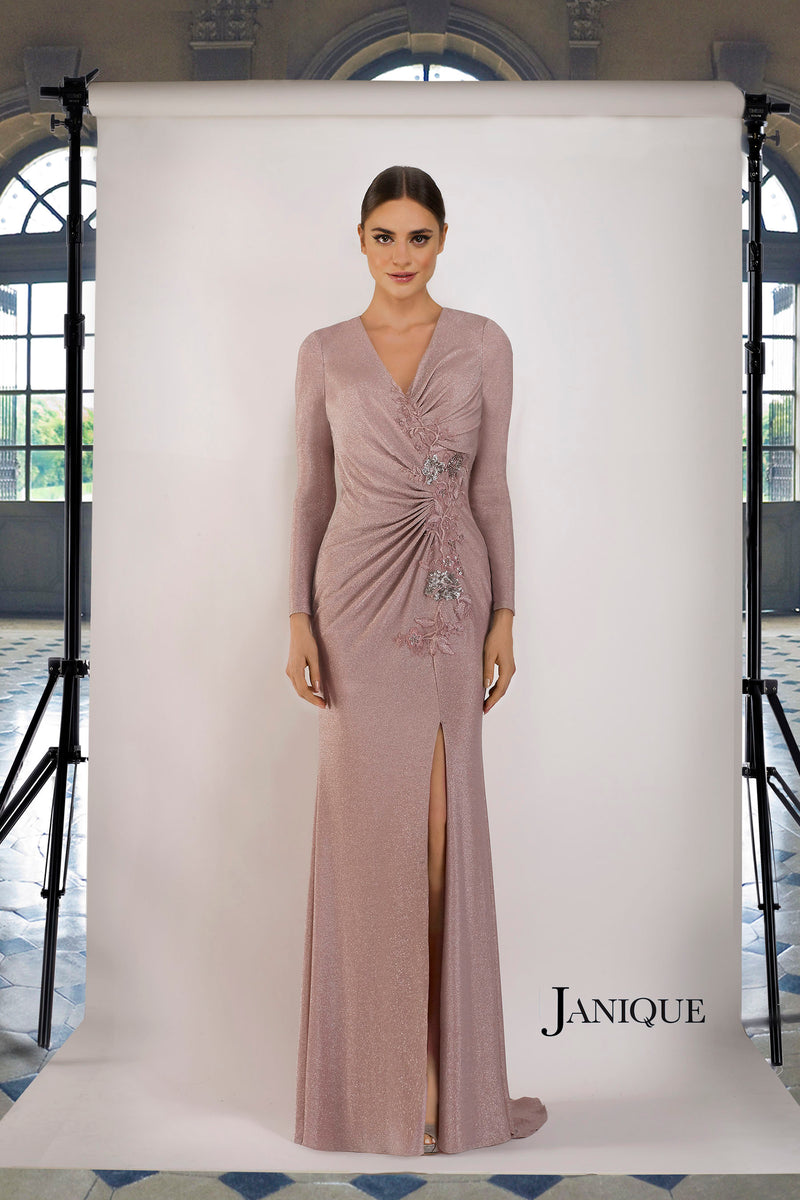 Walk-in style and utmost elegance by wearing this aesthetic party dress by Janique. The sheath gown features a fitted bodice with ruched detailing, unique floral embellishments, V-neckline and long sleeves. Exhibiting a minimalistic design, this party dress has a straight silhouette skirt with side slit, floor-length hem, and a sweeping train.