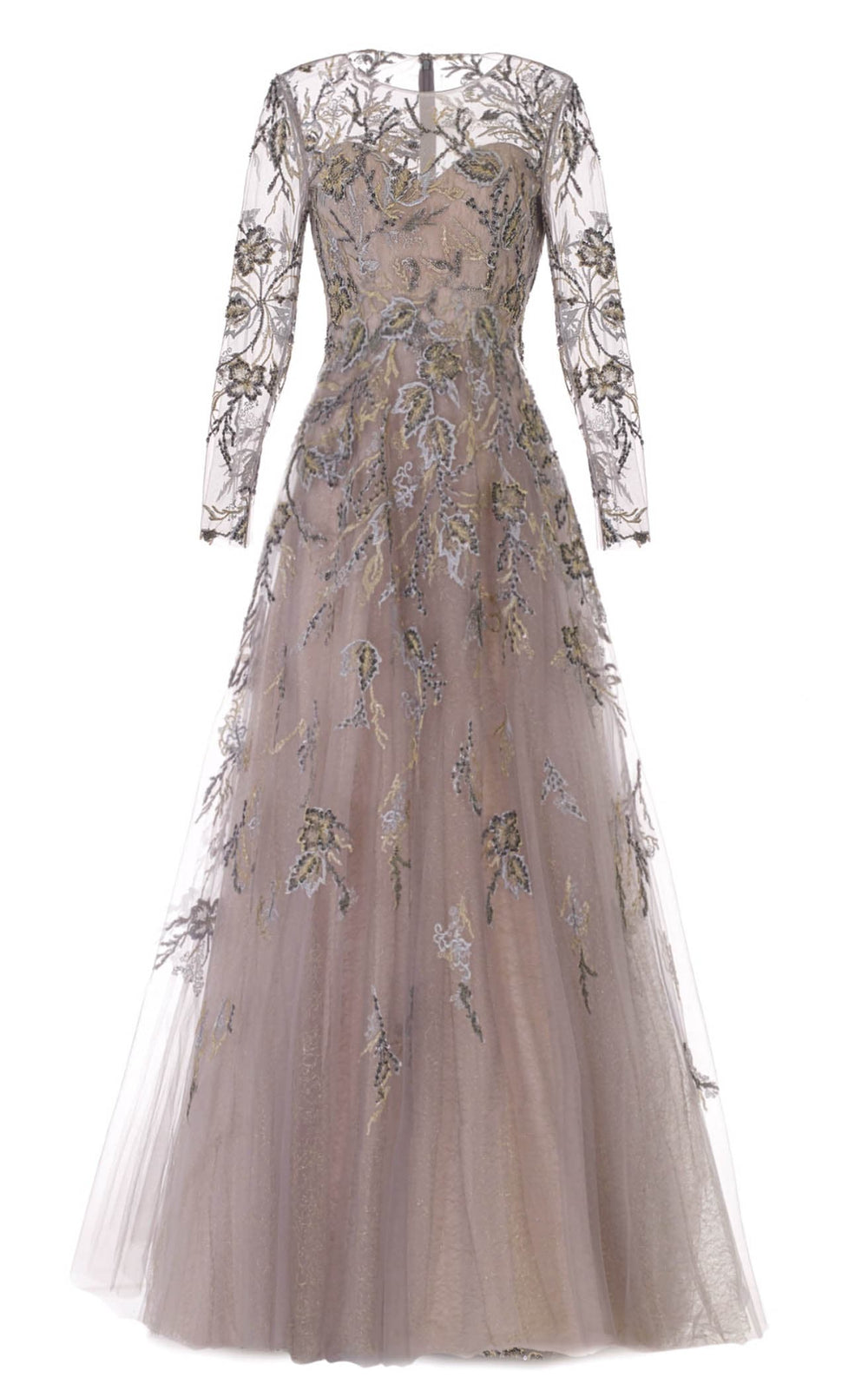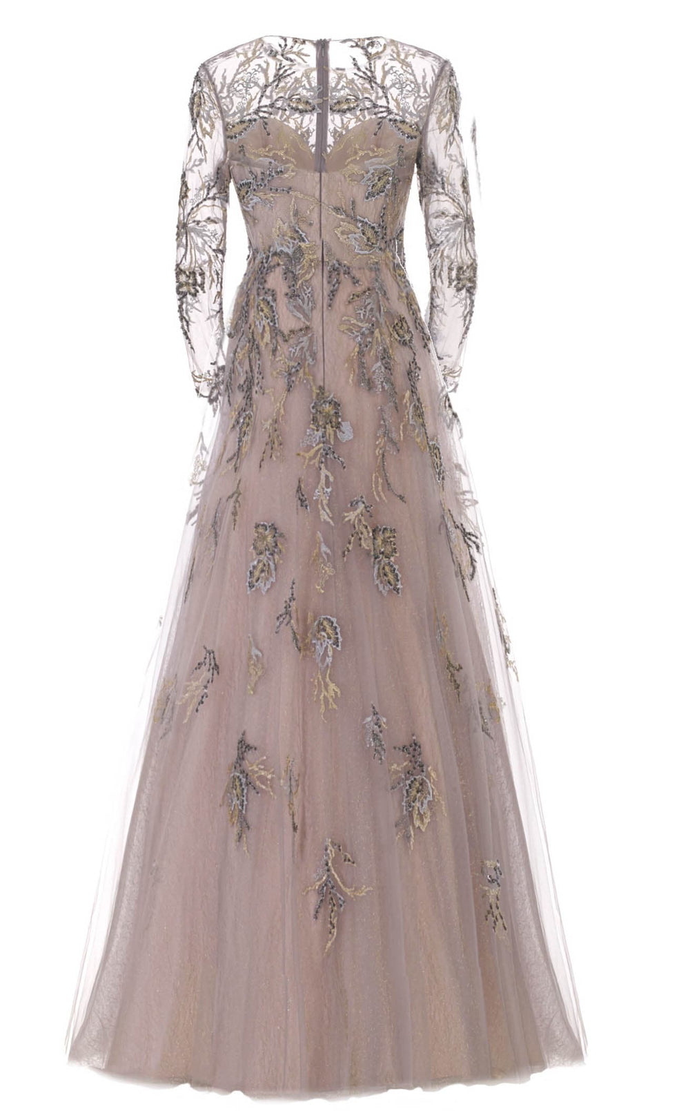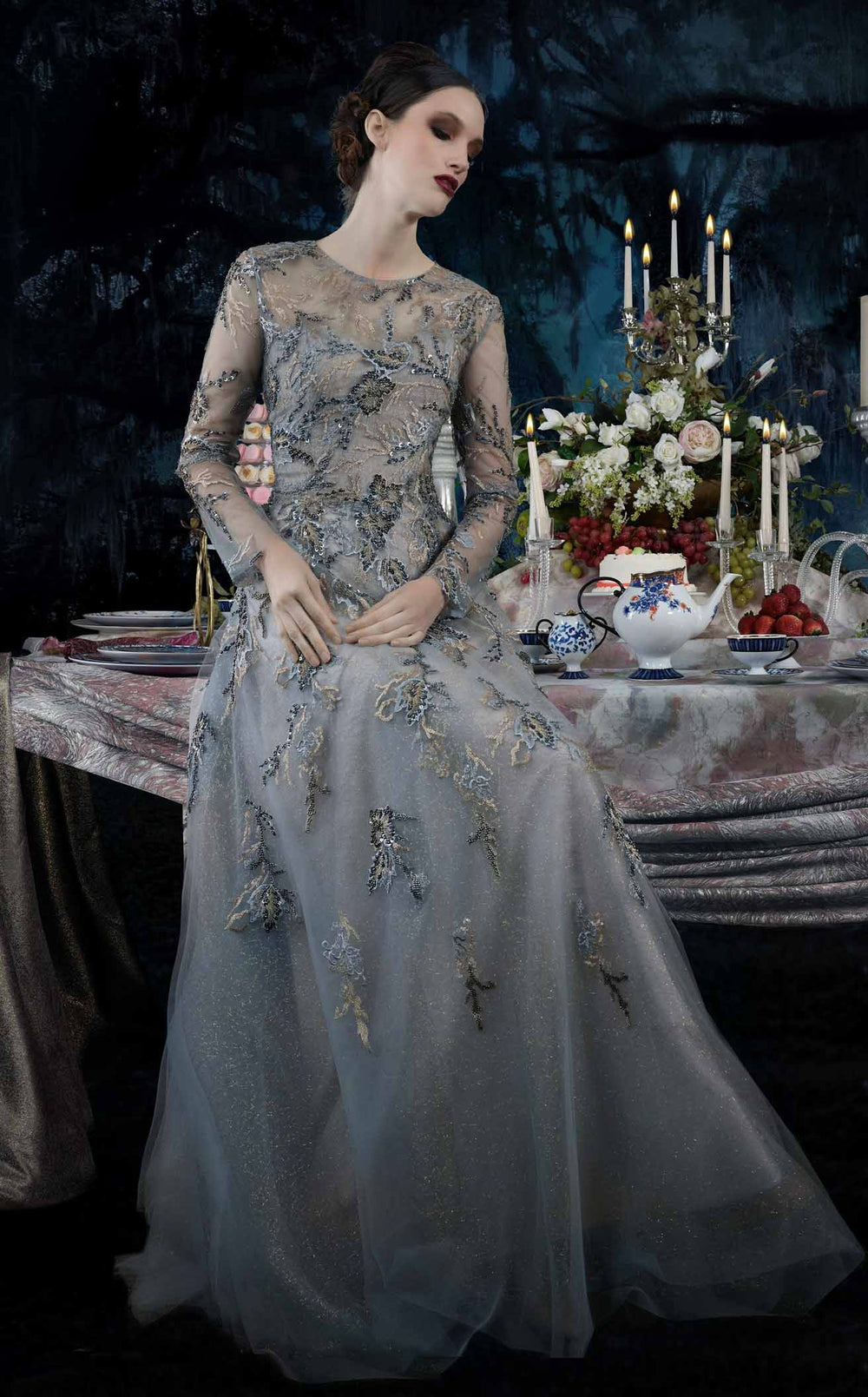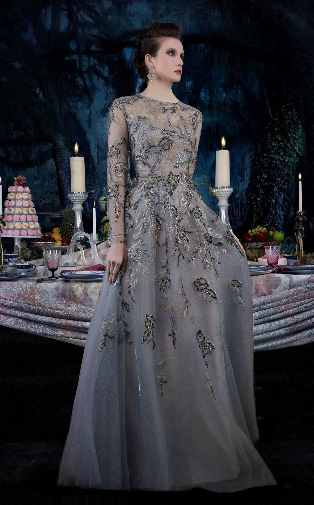 Illusion High Neckline Sheer Long Sleeves Beaded Embroidered Dress by Janique