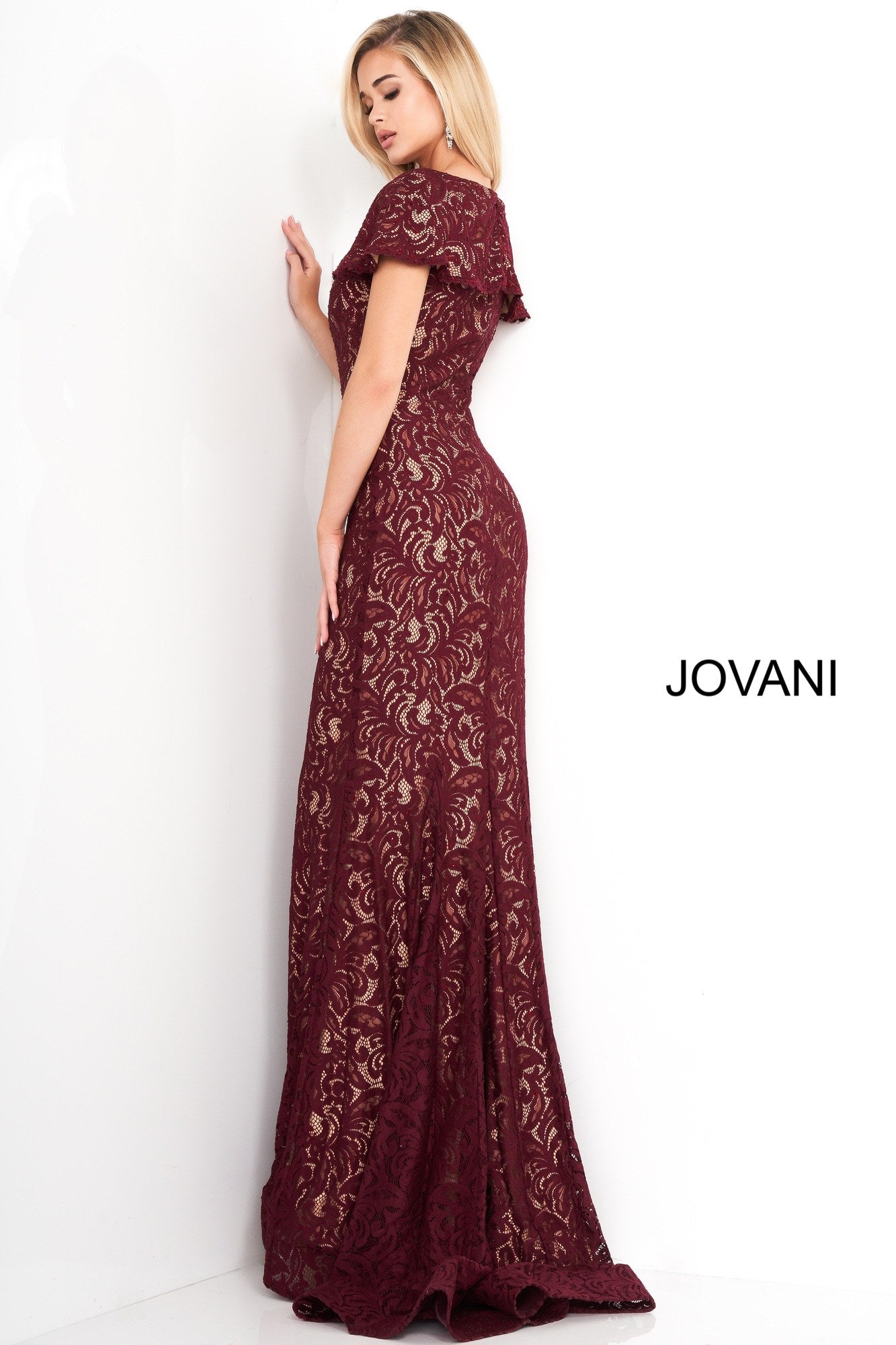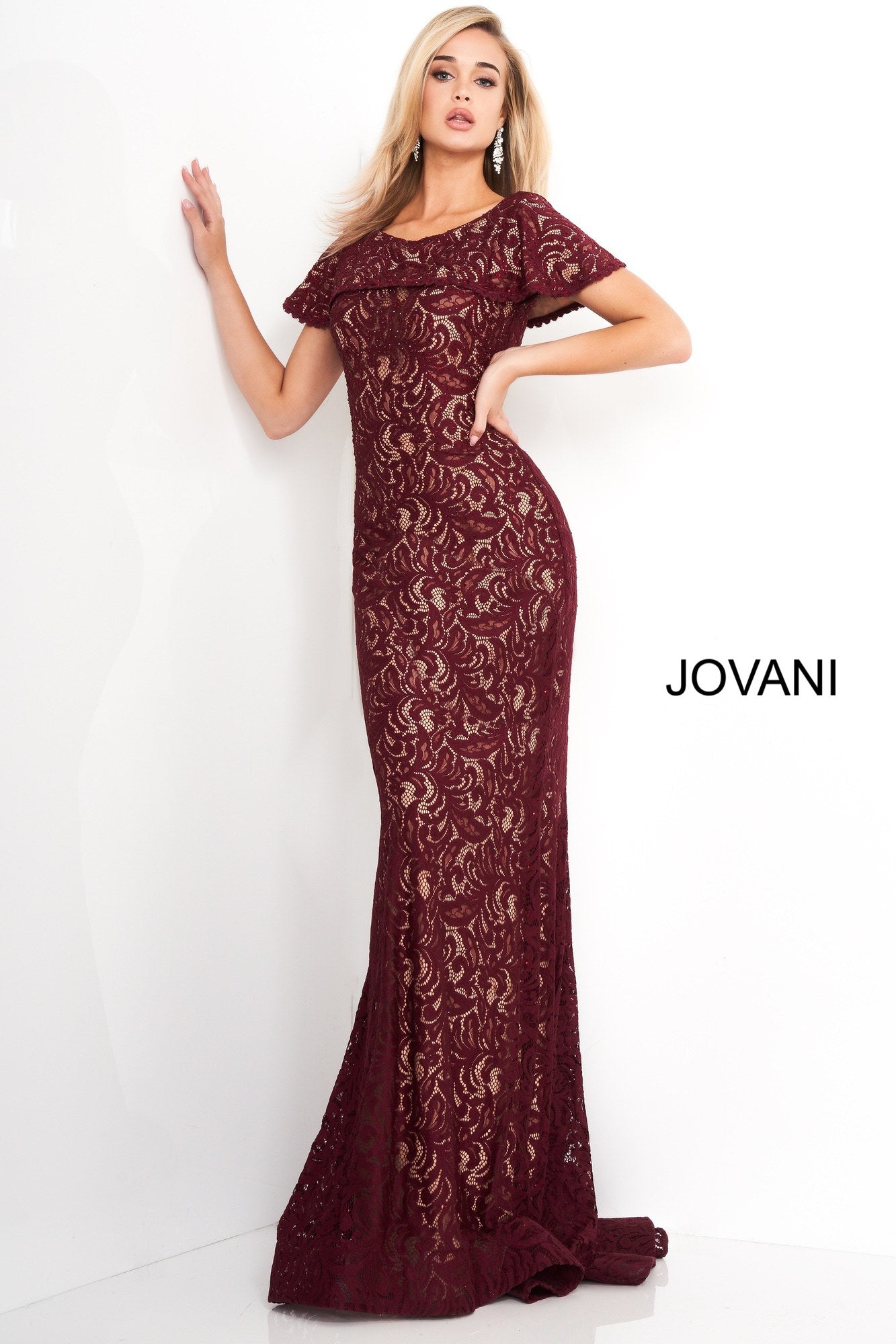 Jovani 02904 Burgundy Lace Short Sleeve Evening Dress