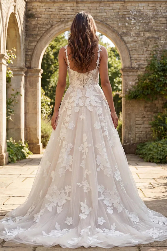 3D Floral Appliqués, Layered Skirt, Sheer Illusion Bodice |
