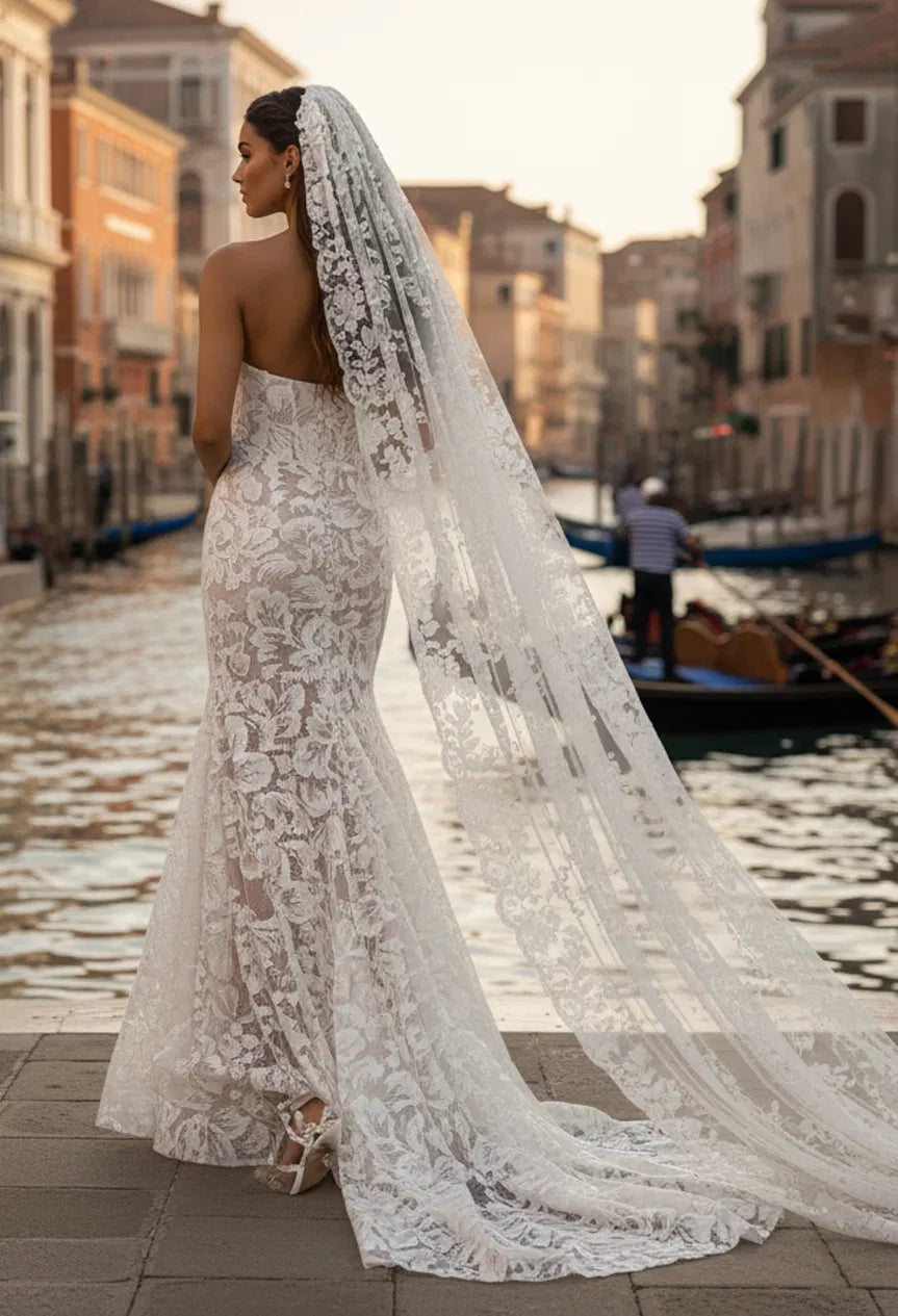 3D Floral Appliqués, Sheer Illusion Bodice, Lace Train |
