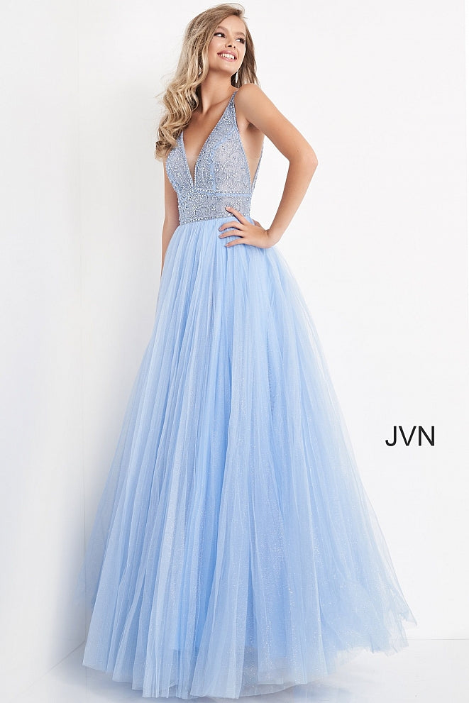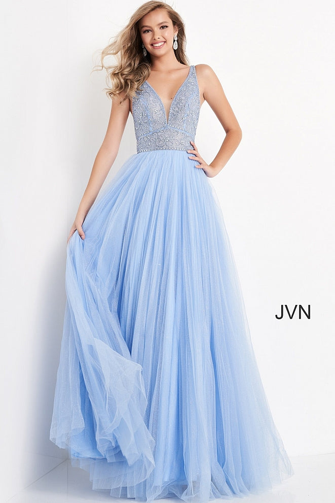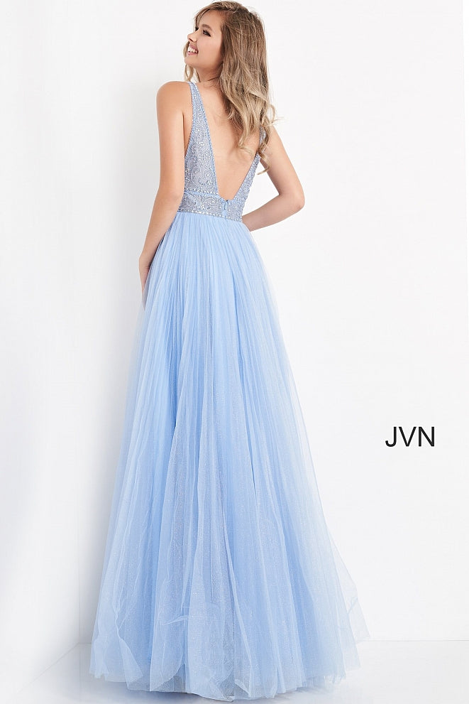 JVN05818 Light Blue Embellished V Neck Prom Dress