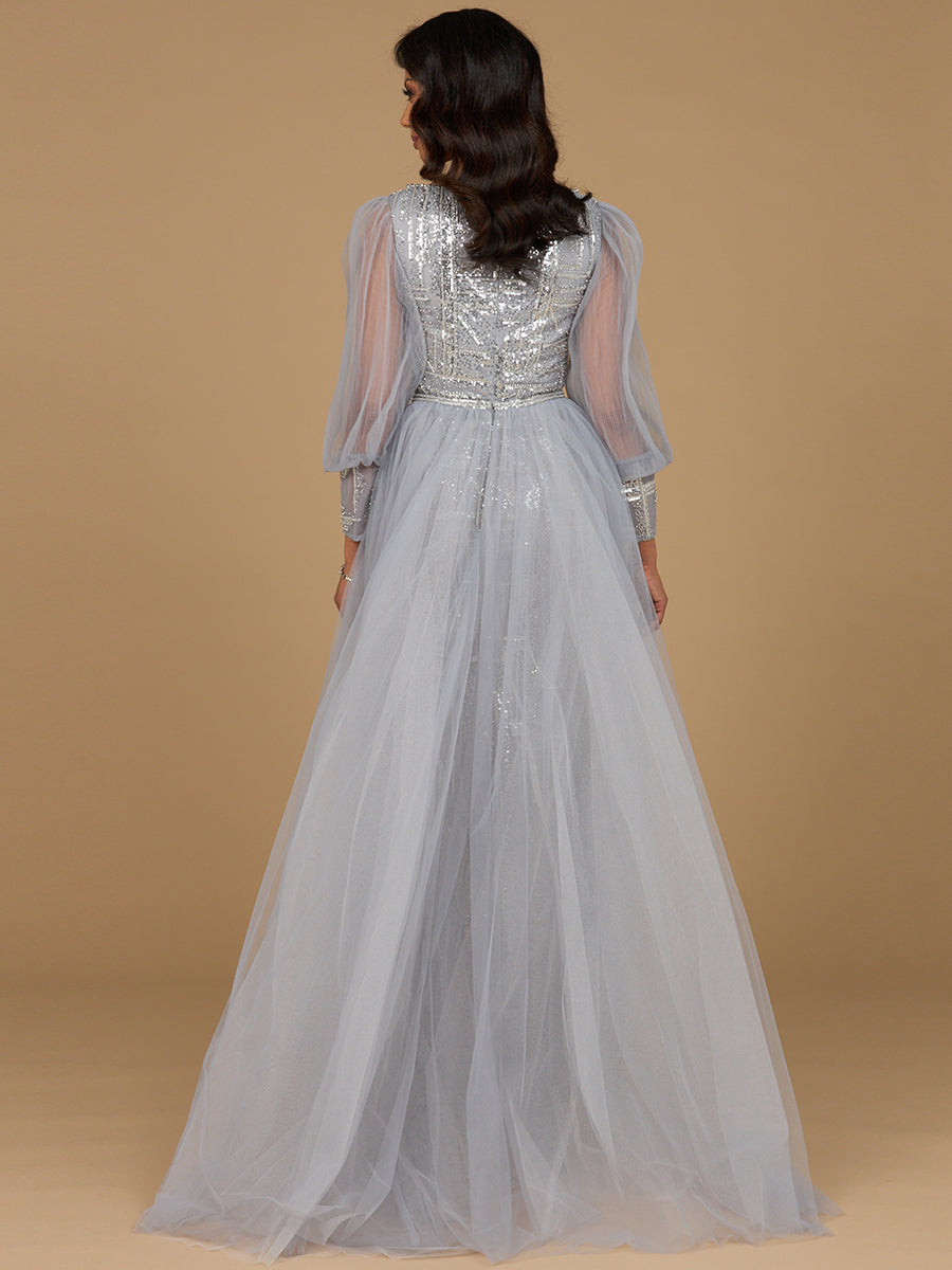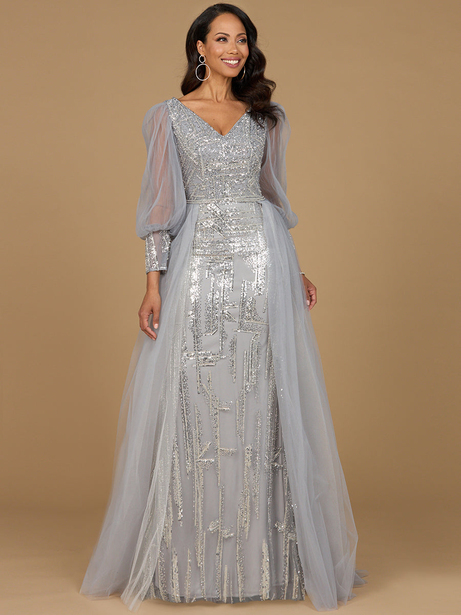v-neckline. This dress features a removable satin over skirt that you can choose to take off for dancing!