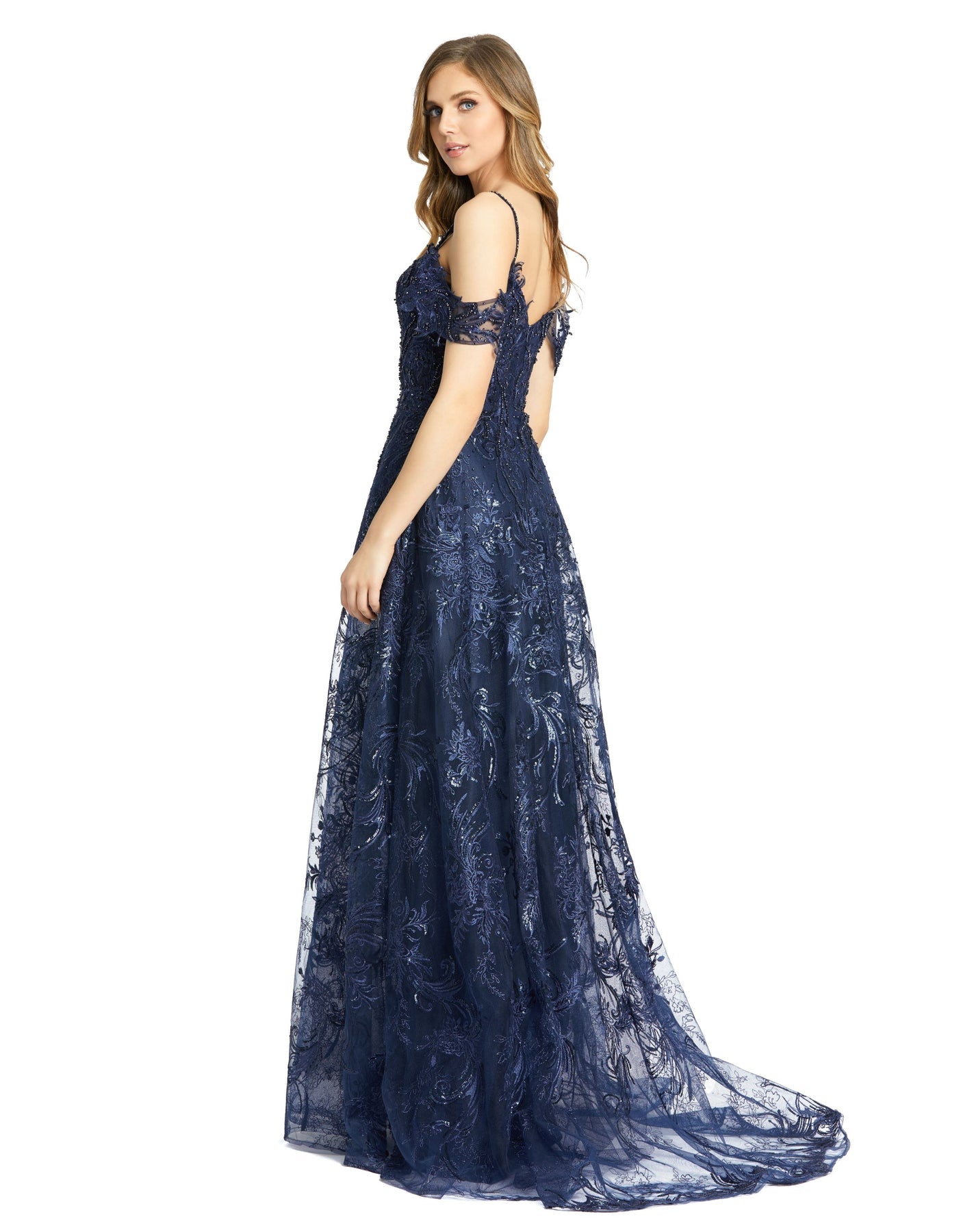 - Embellished off-the-shoulder sleeves with detailed spaghetti straps