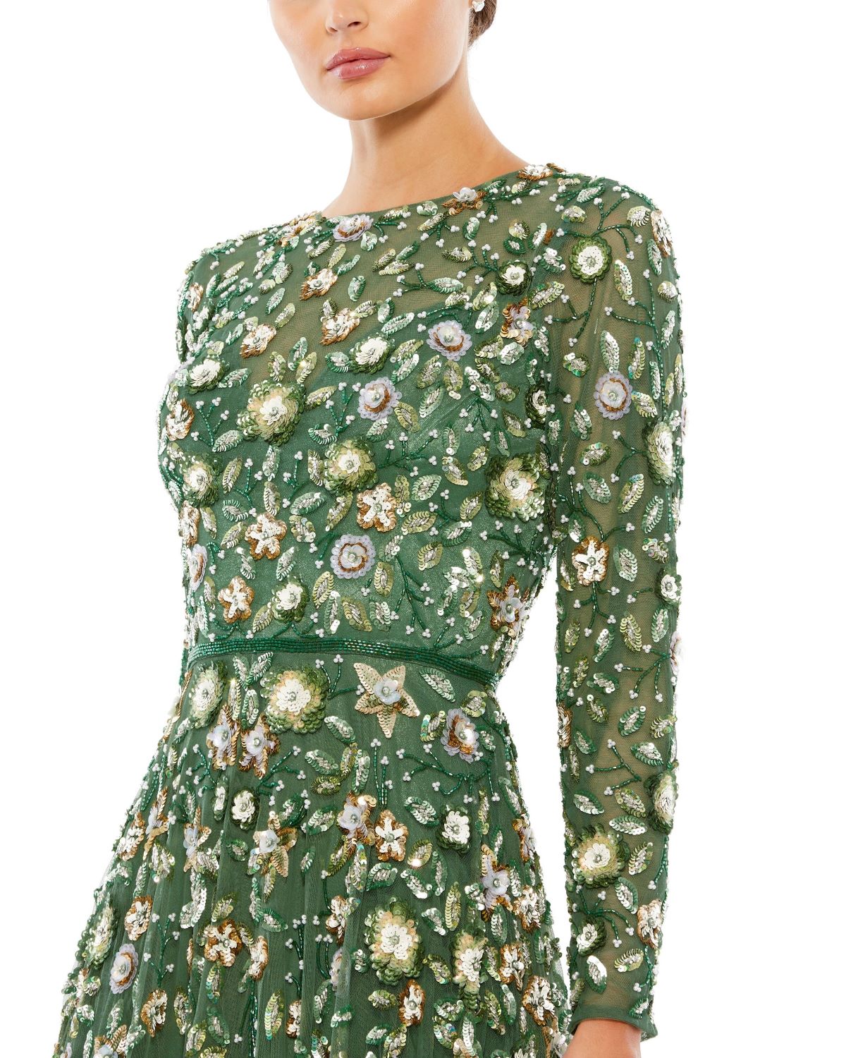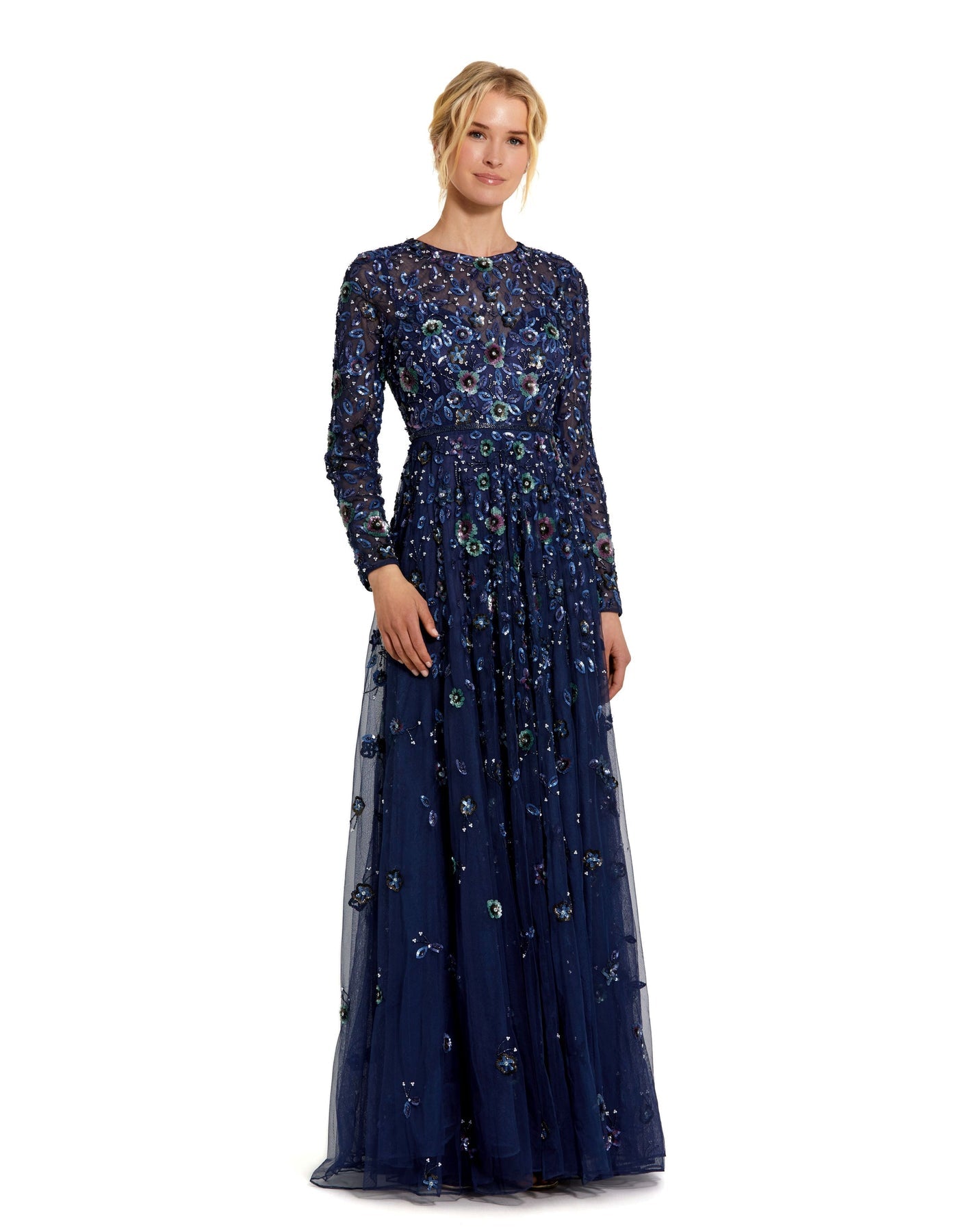 This embellished gown is a breathtaking blend of elegance and glamour. With its high neckline, long sleeves, and allover embellishments, its the perfect gown for evening affairs and black-tie events.