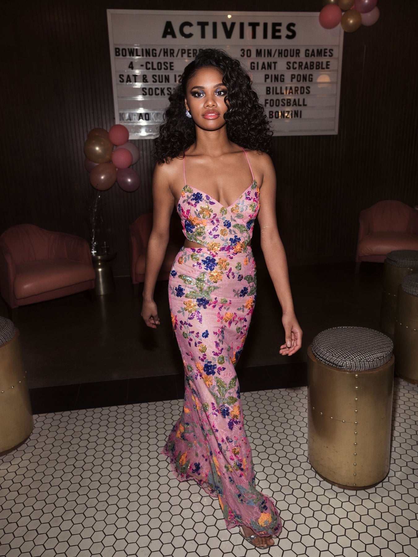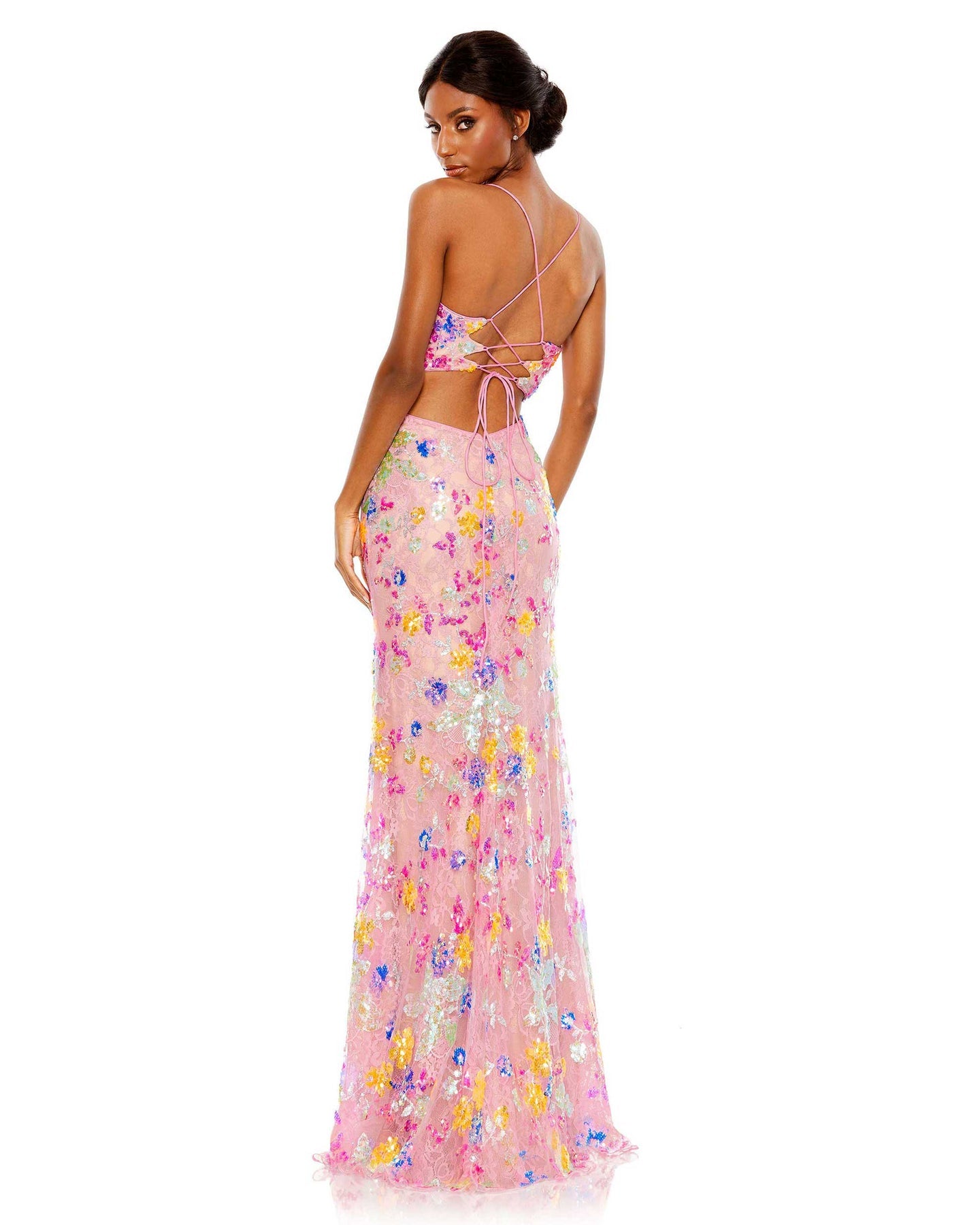 Who knew romantic lace and bright sequins would make the chicest duo ever? Color us obsessed with this slim-fitting gown styled with spaghetti straps, a sweetheart neckline, and side cutouts. The crisscross and lace-up back detail adds a fresh finish.